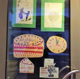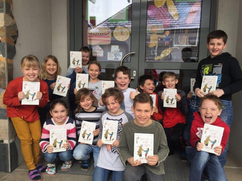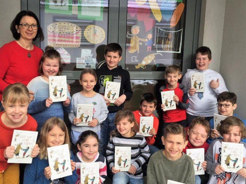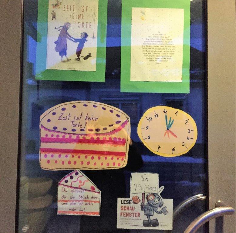 Die Zeit beschäftigt sowohl Erwachsene, als auch Kinder. Das Buch mit dem eigenartigen Titel "Zeit ist keine Torte" erweckte die Neugier der Kinder. Zuerst hatten die Kinder keine Vorstellung, welcher Inhalt sich dahinter verbirgt. Nachdem wir die ersten Seiten gemeinsam gelesen hatten, war das Interesse schnell geweckt. Auf humorvolle Weise erfuhren die Kinder, wofür und für wen man sich Zeit nehmen sollte. Das wird auch im Lesefenster dargestellt und soll die Besucher zum Nachdenken anregen.