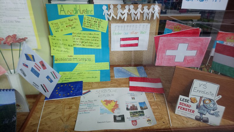 Die VS Ennsleite hat ein Leseschaufenster zum Buch "Kinder aus aller Welt" gestaltet.