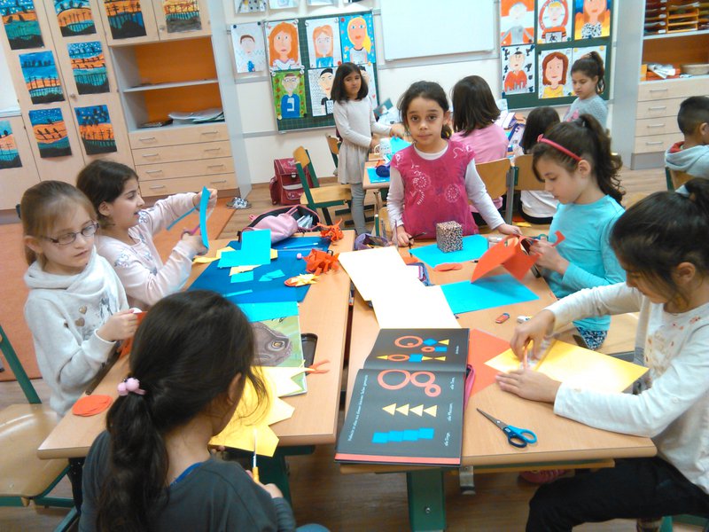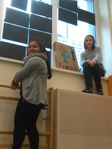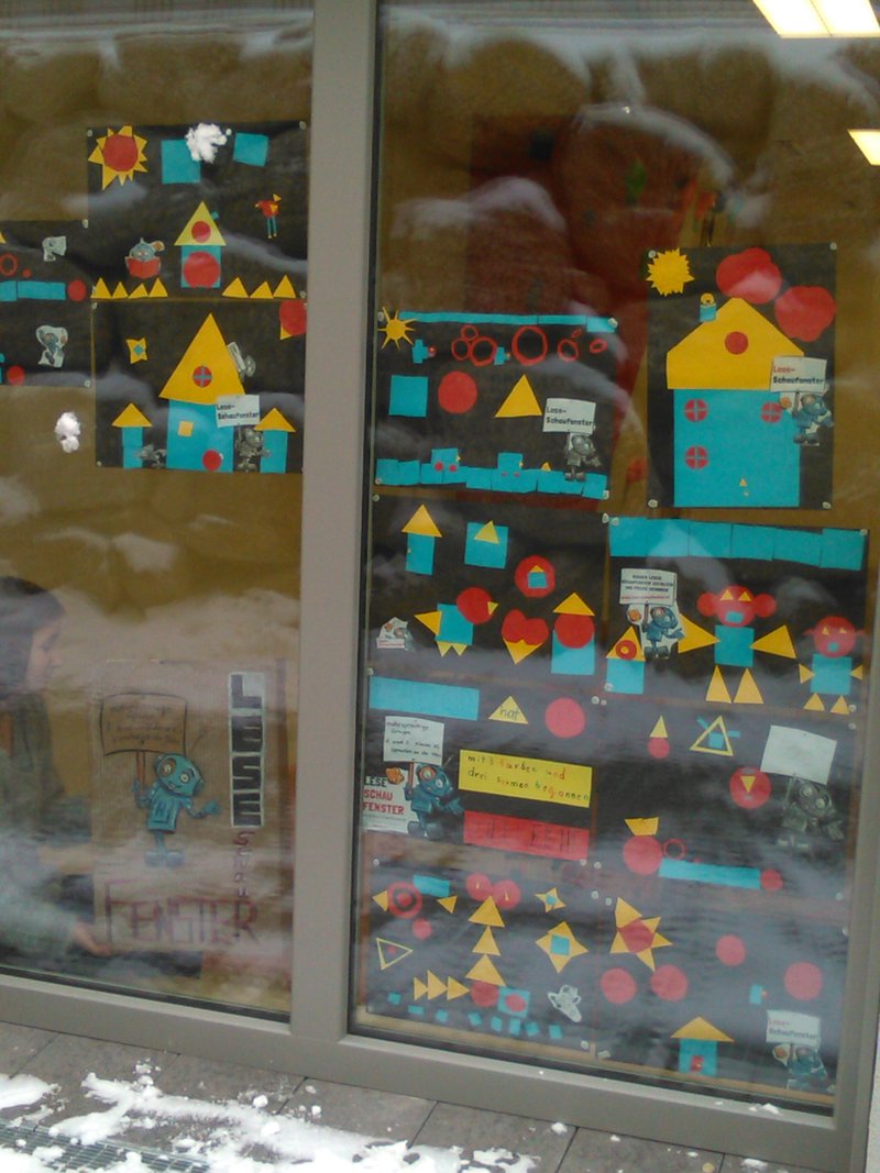 Wir haben ein Buch gelesen. Es heißt „Vielleicht“. Der Autor heißt Guido van Genechten. Er kommt aus Belgien. Dann haben wir uns das Buch angeschaut und aus roten Kreisen, blauen Vierecken und gelben Dreiecken Bilder gestaltet. Mit nur drei Farben und drei Formen kann man Geschichten erfinden. Unsere Lehrerin hat mit den Jugendlichen von "Mutig voneinander lernen" unser Schaufenster in der Kletterhalle ausgestellt. Wir haben Frau Bürgermeisterin eingeladen und dann waren wir in der Zeitung.