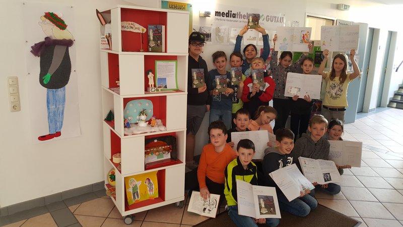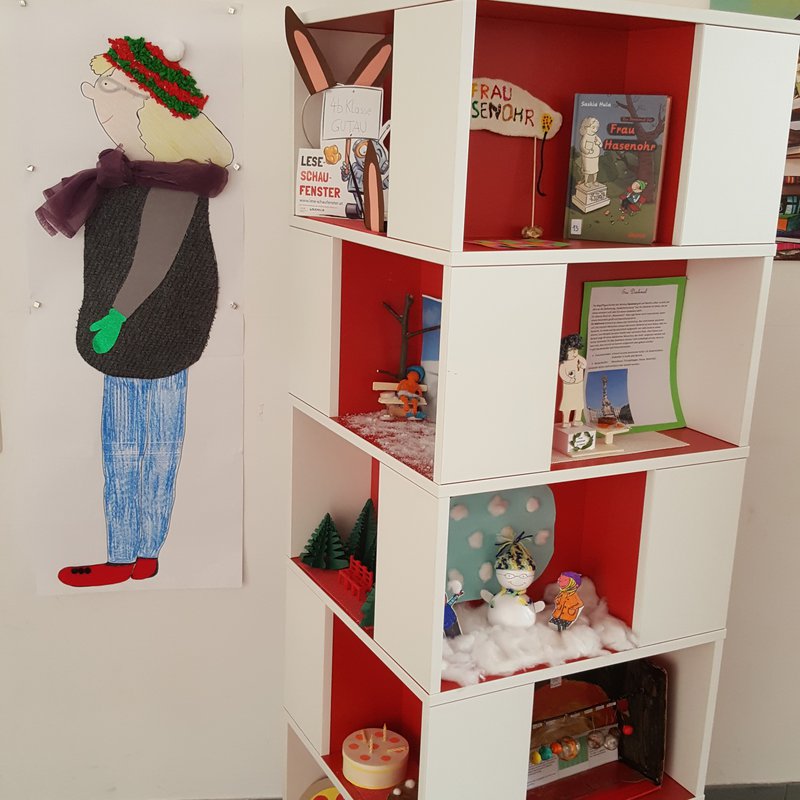 Auch in diesem Jahr gibt es wieder eine Lesepartnerschaft zwischen den Kindern der 2.Klasse und der 4.b Klasse. Der Spaß beim Vorlesen und Zuhören des Buches "Ein Denkmal für Frau Hasenohr" war nicht zu überhören. Ein Bücherregal im Eingangsbereich der Mediathek wurde zu einem echten Hingucker umgestaltet. Wochenlang arbeiteten die Kinder der 4.b Klasse an der kreativen und künstlerischen Umsetzung des Buches. Kurz nach Ostern konnten wir unser Schaufenster eröffnen.- Projektleitung: