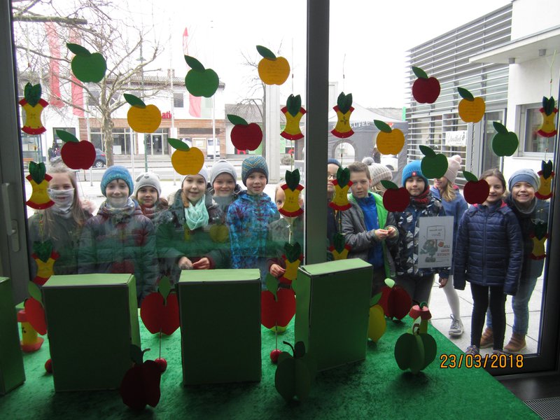 Die Kinder der 3a-Klasse lasen ein Buch von der Apfelhexe Petronella Apfelmus mit dem Titel "Ein Überraschungsfest für Lucius". Nachdem die Schülerinnen und Schüler einige Bilder aus der Geschichte bemalt hatten, wurden diese in Kartons geklebt. So konnten im Leseschaufenster ein paar Szenen aus dem Buch gezeigt werden. Richtig bunt wurde das Schaufenster durch die tollen Bastelarbeiten der Kinder. Eifrig fertigten alle gemeinsam zwei Apfelmobiles an und bastelten aus verschiedenen Materialien köstliche Äpfel. Außerdem wurden interessante Redewendungen zum Thema "Apfel" gesammelt. Jedes Kind verfasste schließlich noch ein lustiges Apfel-Elfchen. So entstand unser buntes Apfel-Leseschaufenster!