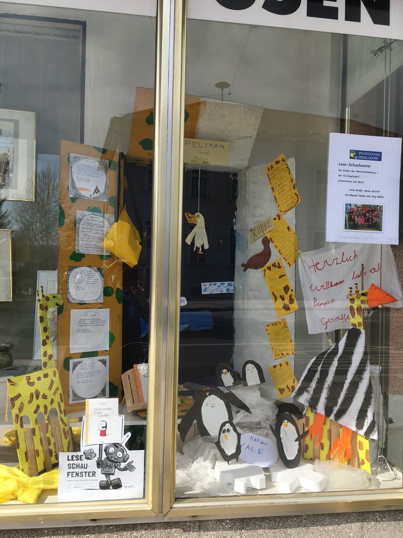 Unsere Leseoma liest den Kindern der Mehrstufenklasse 1 das Buch vor. Die Kinder sind eingeladen, selbst mitzuwirken: Die Kinder der ersten Schulstufe dürfen abwechselnd die Briefe der Giraffe an den Pinguin vorlesen, die Kinder der zweiten Schulstufe lesen die Briefe des Pinguins an die Giraffe vor. Die Giraffen- und Pinguin-Briefe werden gestaltet. Es werden Bilder gezeichnet, wie sich die Giraffe einen Pinguin vorstellt. Die Schülerinnen und Schüler der dritten und vierten Schulstufe stellen im Werkunterricht die Kulisse samt Darsteller/innen her. Eine riesengroße Schachtel wird zum offenen Bilderbuch: In ihr gestalten die Kinder nun die Spielorte des Buches - Savanne, Ozean und Antarktis. Die Kinder entwerfen Forscherbriefe mit ihren Fragen an die Forscher der Antarktis. Diese werden auf Briefpapier geschrieben und der Klasse vorgelesen. Vor den Osterferien wird die kleine Auslage eingerichtet. Am 9. April 2018 feiern wir die Eröffnung unseres Lese-Schaufensters.- Projektleitung: