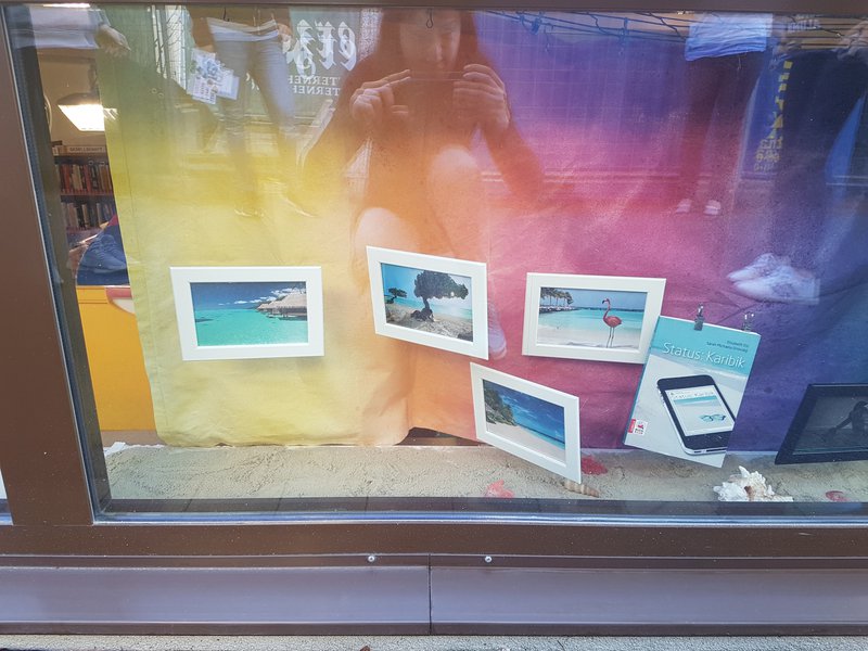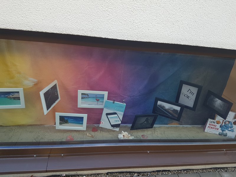 Wir haben das Buch "Status Karibik" geradezu verschlungen. Nach unserer Buchpräsentation im Deutsch-Unterricht haben wir in BE und Werken unser Schaufenster gestaltet. Am Farbverlauf des Hintergrundes sollen Passantinnen die über Facebook vorgetäuschte Stimmung von Sonja (Hautfigur) erkennen. Den Stoff haben wir mit Graffitti-Stofffarben besprüht. Die hellen Bilderrahmen mit den Urlaubsschnappschüssen stehen den schwarzen Rahmen mit den trüben, düsteren Bildern gegenüber. Sie sollen Sonjas reale, depressive Gefühlswelt widerspiegeln.- Projektleitung: