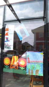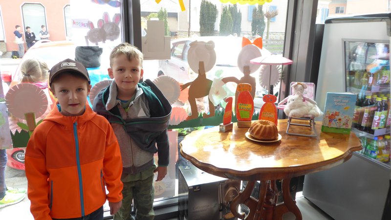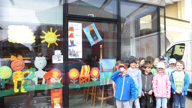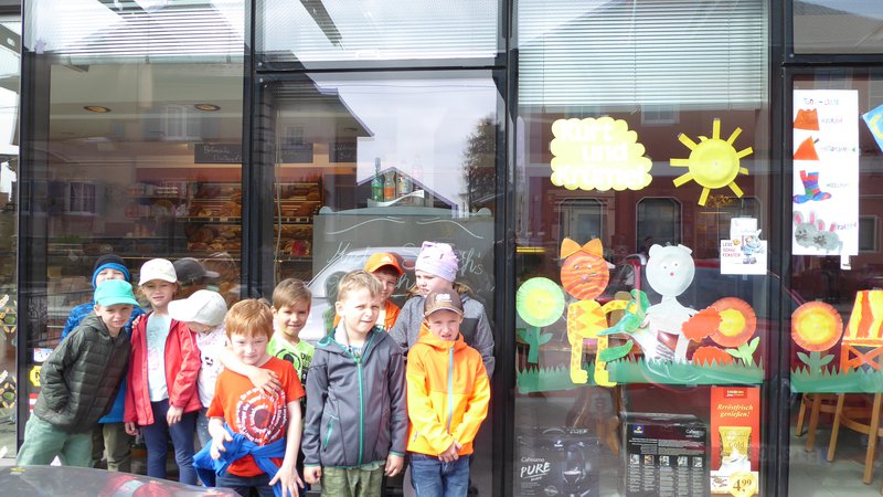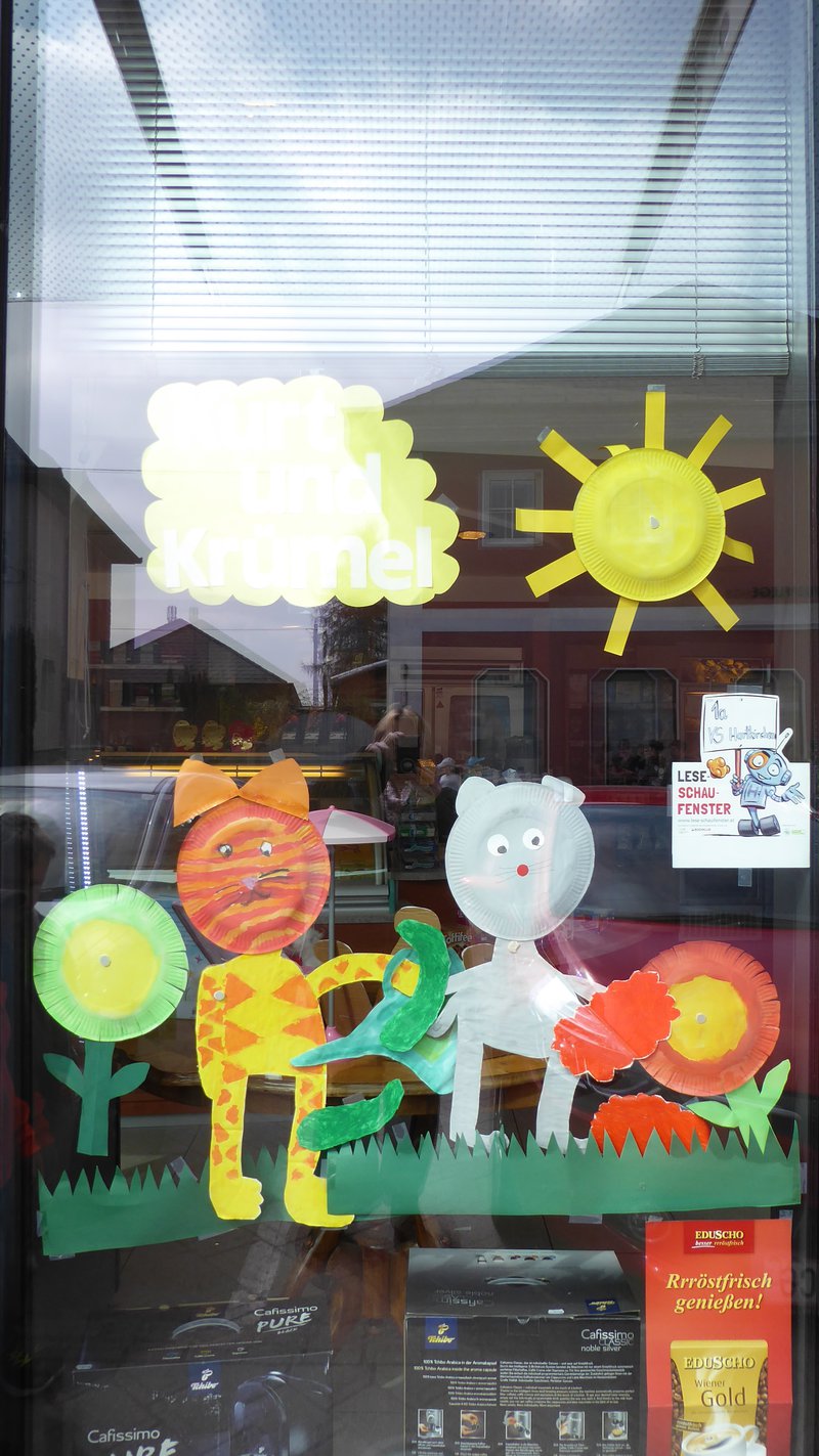 Die Kinder der 1.a Klasse haben gemeinsam die beiden Hauptfiguren Kurt und Krümel gestaltet. Weiters wurden Blumen, eine Wiese, ein Liegestuhl, die Sonne, Himbeeren und Gurken gemalt. Am allerwichtigsten war die ToDo - Liste. Auch Marmeladengläser wurden gezeichnet. Auch die Rakete der Maus wurde gestaltet und 2 A4 Bilder. In der Bäckerei wurde uns noch ein Tisch zur Verfügung gestellt und dort befindet sich jetzt ein Sonnenschirm, Ein Liegestuhl mit Katze und Maus, einige Marmeladengläser und EIN SELBSTGEBACKENER GUGLHUPF der Bäckerei. Viele Kinder unserer Schule können dieses Schaufenster bewundern, weil gegenüber die Bushaltestelle ist.- Projektleitung: