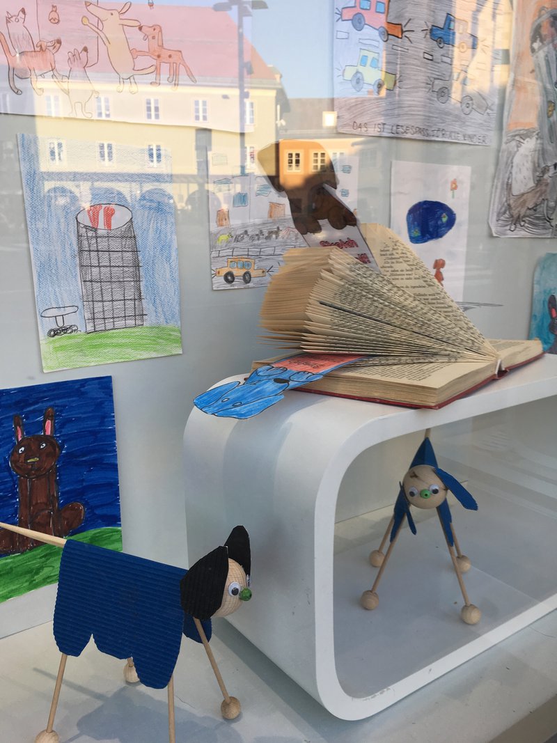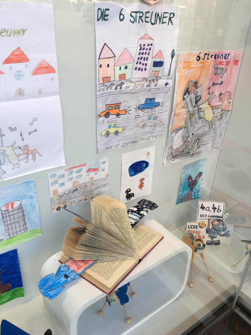 Sechs Hunde, die alle einmal ein Zuhause gehabt haben, streunen durch die Stadt und kämpfen täglich ums Überleben. Die 4. Klassen haben das mit sehr viel Einfühlungsvermögen geschriebene Buch über sechs ausgesetzte Hunde gelesen und den Kindern ist bewusst geworden, wie wertvoll eine Familie und ein sicheres Heim für uns alle ist. Wir dürfen unsere gebastelten Hunde, Zeichnungen, Lesezeichen und Plakate bei einem Optiker zwischen seinen Lesebrillen präsentieren.... So gibt es für niemanden eine Ausrede, zu einem guten Buch zu greifen.- Projektleitung: