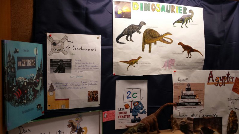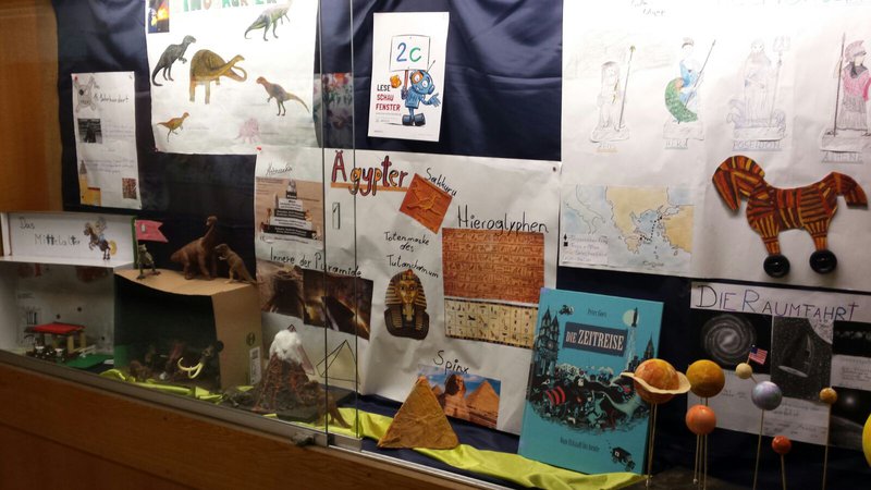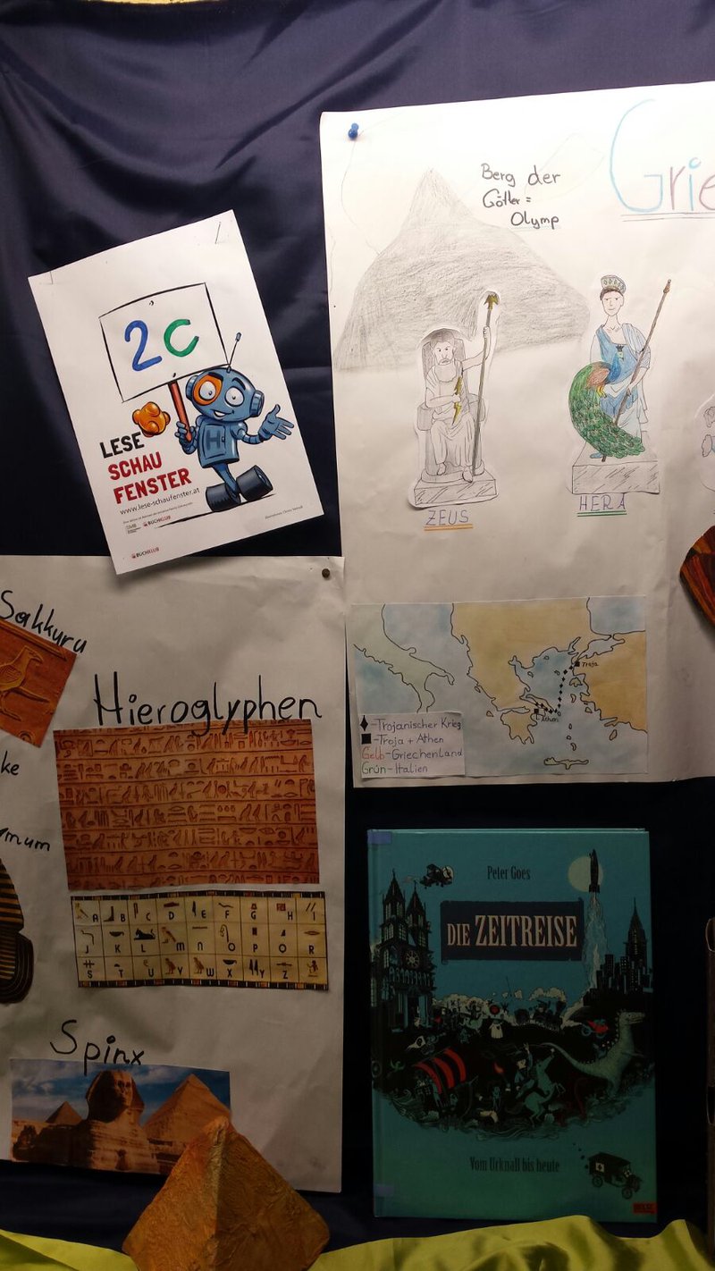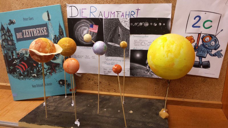Nachdem in der 2. Klasse das Fach „Geschichte und Politische Bildung“ neu dazu kam, suchten sich die Schüler der 2c-Klasse das Buch „Die Zeitreise“ von Peter Goes aus. Auf einem Zeitstrahl reist der Betrachter durch die Geschichte der Welt. In kunstvoll gezeichneten Bildern werden auf jeder Doppelseite eine Epoche oder ein Zeitalter dargestellt. Die Schüler konzentrierten sich dabei auf jene Epochen, welche in der 2. Klasse unterrichtet werden. Eine Gruppe wählte das Zeitalter der Raumfahrt aus.- Projektleitung: