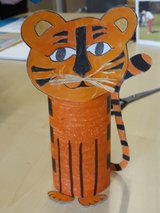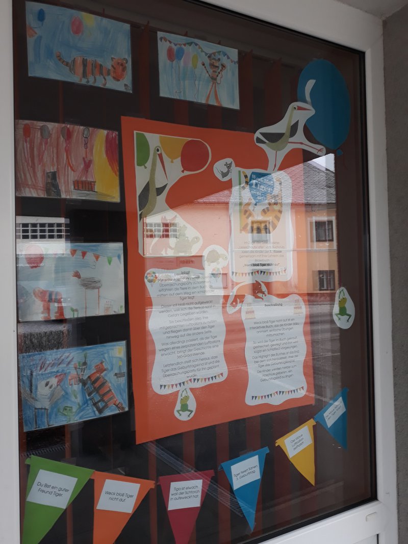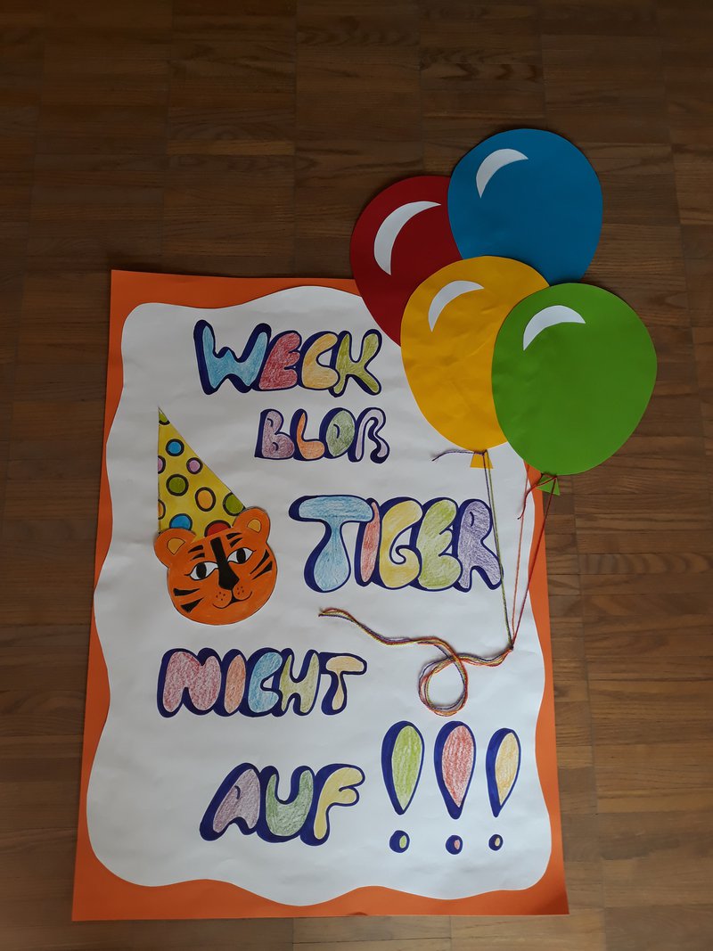 "Weck bloß Tiger nicht auf" ist ein interaktives Buch, das die Kinder der ersten Klasse dazu animierte, einfache Übungen mitzumachen. So wurde der Tiger im Buch gekrault, gestreichelt, gewiegt und ihm wurde sogar ein Schlaflied vorgesungen. Das Highlight des Buches war das End, bei dem sich herausstellte, dass der Tiger das Geburtstagskind ist. Die Kinder wurden hierbei zum Abschluss gebeten, ein Geburtstagslied zu singen. Im Zuge des Projektes wurde in der ersten Klasse fleißig gebastelt und gemalt. Auch Sätze zum Buch wurden bereits – zwar noch lautgetreu, aber sehr kreativ - verfasst.