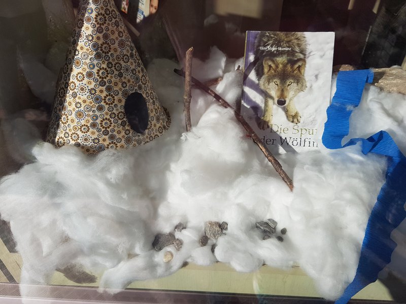 Wir haben das Buch "Die Spur der Wölfin" gelesen (Leider haben wir ein Buch aus einer falschen Liste ausgewählt - Wir hoffen, dass wir trotzdem am Bewerb teilnehmen können) Mittels einer Buchvorstellung haben wir das Buch dem Rest unserer Klasse in Deutsch vorgestellt. In unserem Schaufenster, das wir in Werken und BE gestalteten, möchten wir die Winterlandschaft aus dem Buch darstellen. Mit Steinen haben wir die Spuren der Wölfin im Schnee (Watte) gelegt. Der Fluss aus Krepppapier führt durch die Winterlandschaft, mit der wir das Gefühl der Kälter vermitteln wollen. Die Tipis haben wir aus Ästen und Stoff gebaut.- Projektleitung:
