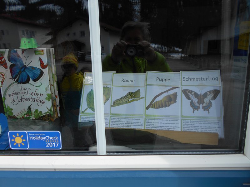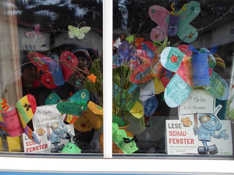 Die Schüler der 1. /2. Schulstufe der VS Grän wählten das Sachbuch „Das wundersame Leben der Schmetterlinge“. Die Kinder waren fasziniert von der Vielfalt und wie facettenreich Schmetterlinge sind. Es beinhaltet viele Informationen über das Leben. Auch die Entstehung wird ganz genau beschrieben und mit anschaulichen Bildern erklärt. Wir haben ein Schmetterlingsbüchlein bearbeitet. Anschließend bastelten die Kinder Schmetterlinge und Raupen, die liebevoll gestaltet, bemalt und verziert wurden. Im Schaufenster steht eine Vase mit Kirschzweigen, an denen die Schmetterlinge und Raupen befestigt wurden. Die Entstehung wird mit Bildern und kurzen Texten nochmals beschrieben.