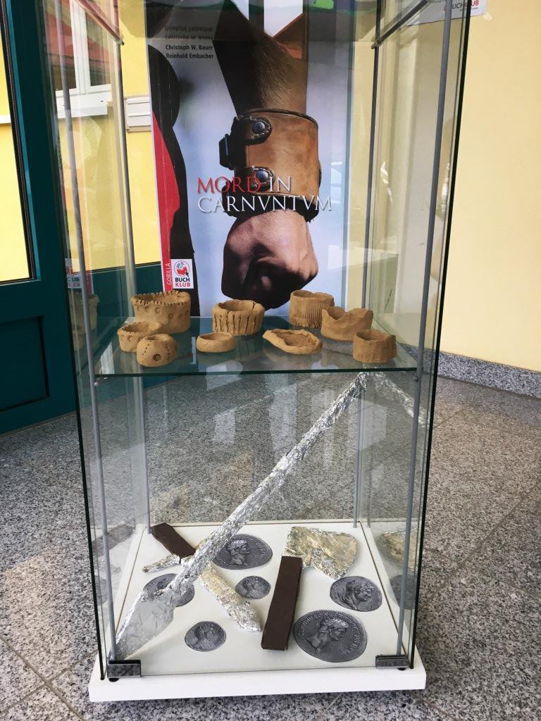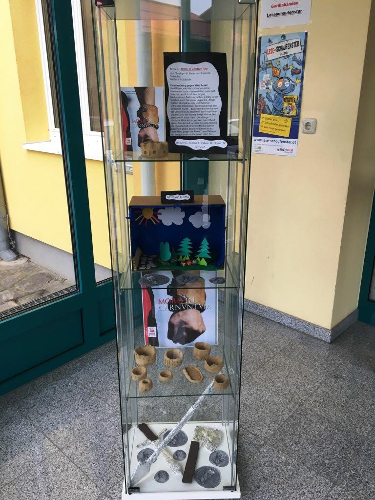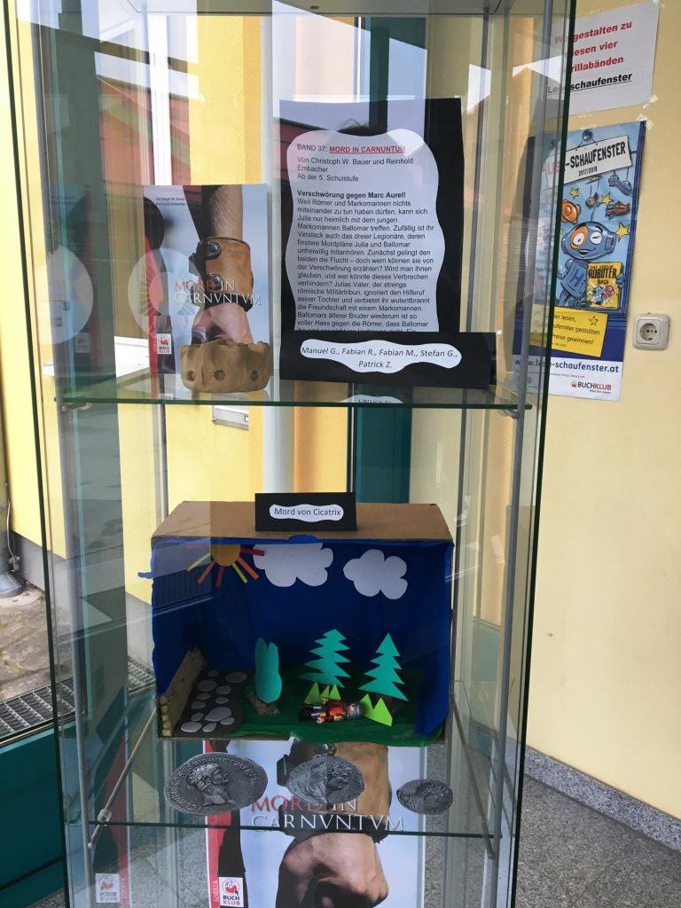 Die Schüler gestalteten einen Schaukasten zu ihrem gewählten Buch und beschreiben das Buch wie folgt: Wir haben dieses Buch gewählt, weil die Leseprobe, die wir bekommen hatten, sehr spannend war. Das Buch handelt von der Römerin Julia und Markomanne Ballomar. Im BE-Unterricht besprachen wir, welche Materialien wir für unser Leseschaufenster benötigen würden. Im ersten Teil unseres Schaufensters sieht man die Ton-Gefäße von Ballomars Mutter. Im zweiten Teil erkennt man die Darstellung des geschehenen Mordes, der hinter dem Busch liegt. Ganz unten haben wir die Waffen, mit denen die Römer früher gekämpft haben, visualisiert. Dieses Buch war für uns sehr spannend zu lesen, aus diesem Grund war es für uns sehr einfach und lustig, das Leseschaufenster zu erarbeiten.