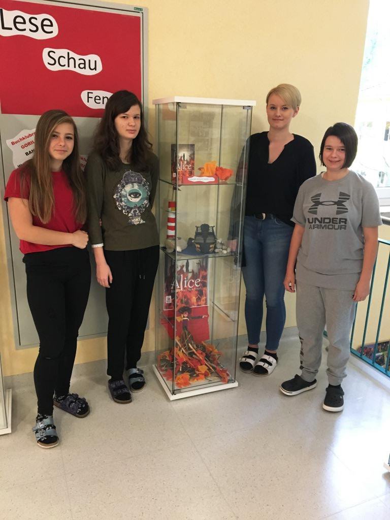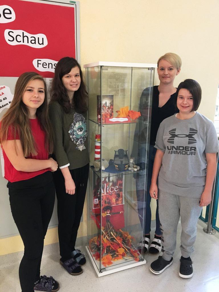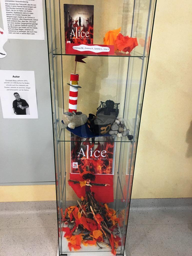 Wir wählten das Buch, da uns der Einband sehr interessant erschien und uns auch die kurze Inhaltsangabe sehr zusagte. In der Schule gestalteten wir ein Plakat zum Buch, welches wir unserer Klasse präsentierten. In unserem Leseschaufenster haben wir den Scheiterhaufen dargestellt, auf dem Alice verbrannt wurde, weil wir diese Stelle sehr interessant fanden. Man sind in unserem Schaufenster auch das Fährschiff, auf dem Alex nach Irland fahren sollte - diese Szene ist für uns ein Schlüsselmoment im Buch.