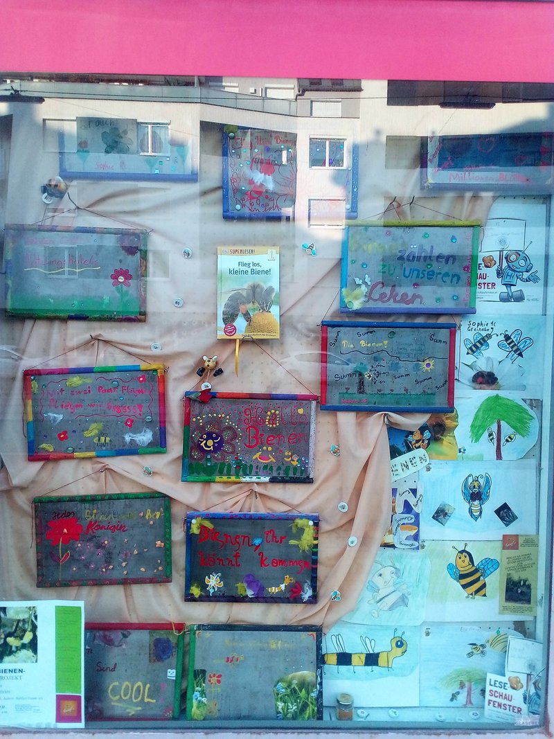 Jedes Kind gestaltete seine eigene Bienentafel . Die meisten Bienentafeln können in der Buchhandlung Freudensprung bewundert werden, einige auch im Schulhaus.