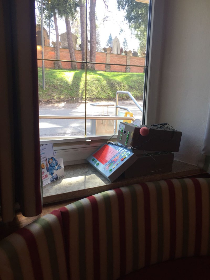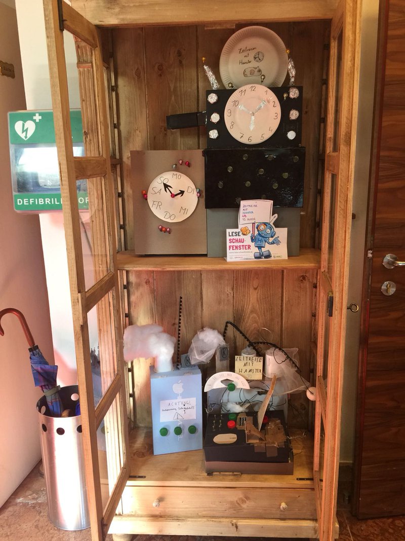 Ausgehend von unserem Buch "Zeitreise mit Hamster" überlegten wir, was wir Passendes herstellen könnten. Da sich im Laufe des Vorlesens herauskristallisierte, dass das zentrale Thema das Auffinden und Betätigen der Zeitmaschine war, teilten sich die Kinder in Gruppen ein. Aus Material, das sie zum Teil von zu Hause mitbrachten, zum Teil auch aus dem Schulfundus verwendeten, wurden gemeinsam die unterschiedlichsten Zeitmaschinen gebastelt. Eine Gruppe entschied sich für eine Zeichnung, die sie als Plakat gestaltete, das Titel und Thema aufgriff. Es war eine sehr produktive und entspannte Beschäftigung, die den Kindern großen Spaß machte.