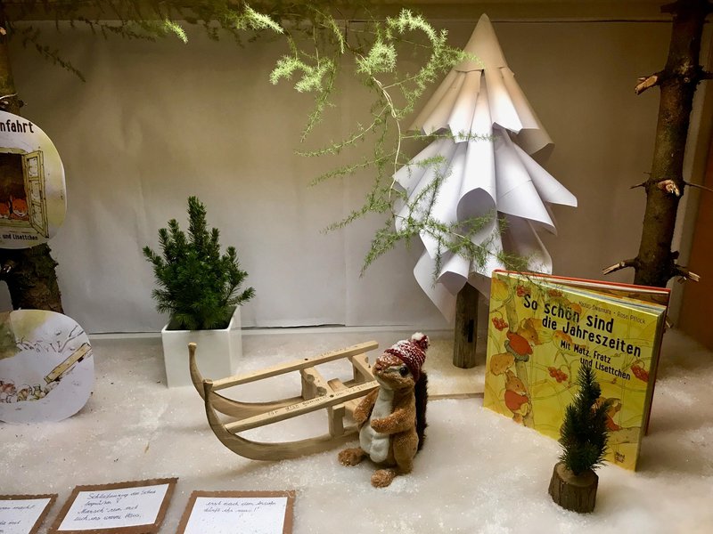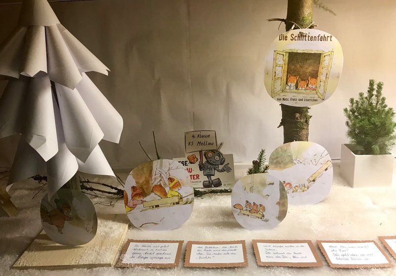 Gerade als der Winter sein erstes richtiges Lebenszeichen gab, beschäftigte sich die 4. Klasse der VS Mellau mit dem Buch „So schön sind die Jahreszeiten“ von Kazuo Iwamura / Rose Pflock. Es war naheliegend, sich die Geschichte von der Schlittenfahrt genauer anzuschauen und dazu dann auch das Lese – Schaufenster der öffentlichen Bibliothek zu gestalten. Der Text in Reimform war für Viertklässler eher einfach zu lesen. Besonderen Spaß hatten die Schüler aber beim Erfinden von weiteren Reimen.- Projektleitung: