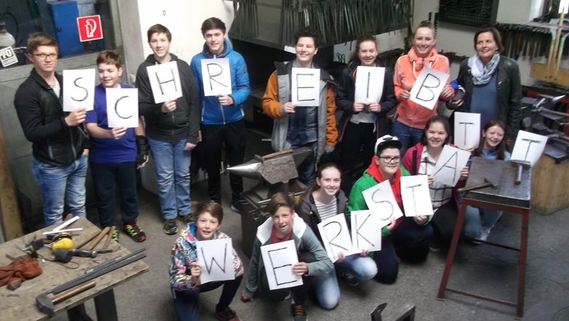Schreibwerkstatt - wortwörtlich genommen, diese Gelegenheit wollten wir uns nicht entgehen lassen. Die Lektüre des Buches und der "Ritt durch die Epochen der Literatur" inspirierten uns zum Ausprobieren. "Wir schreiben am Feuer", lautete die Devise. Zwei Gehminuten von der Schule entfernt durften die Schülerinnen und Schüler die Werkstatt der Kunstschmiede Praxmarer mit Block und Bleistift heimsuchen und sich dort ihre Schreibkünste erproben.- Projektleitung: