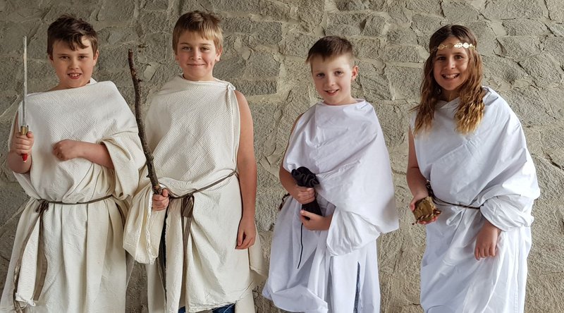 Die Entscheidung der Kinder der 4. Schulstufe fiel gleich auf dieses Buch. Sofort tauchten sie in die Welt der Römer ein. Sie bastelten eine Wachstafel, sammelten verschiedene Dekosachen, um einen römischen Marktstand nachzustellen und malten einen römischen Marktplatz als Hintergrund. Die vier Kinder verkleideten sich als Römer und spielten die Verfolgungsjagd aus dem Buch nach. Dabei entstand eine tolle Fotogeschichte. Das Thema ,,Römer" wird uns jetzt sicher noch einige Zeit begleiten.- Projektleitung:
