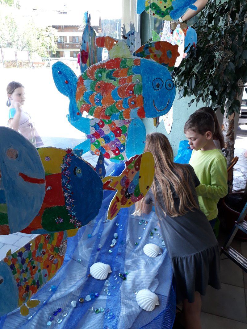 In der Klasse haben wir die Geschichte des Regenbogenfisches gelesen, Fische gebastelt und diese im Schaufenster mit Meereshintergrund und Muscheln ausgestellt.- Projektleitung: