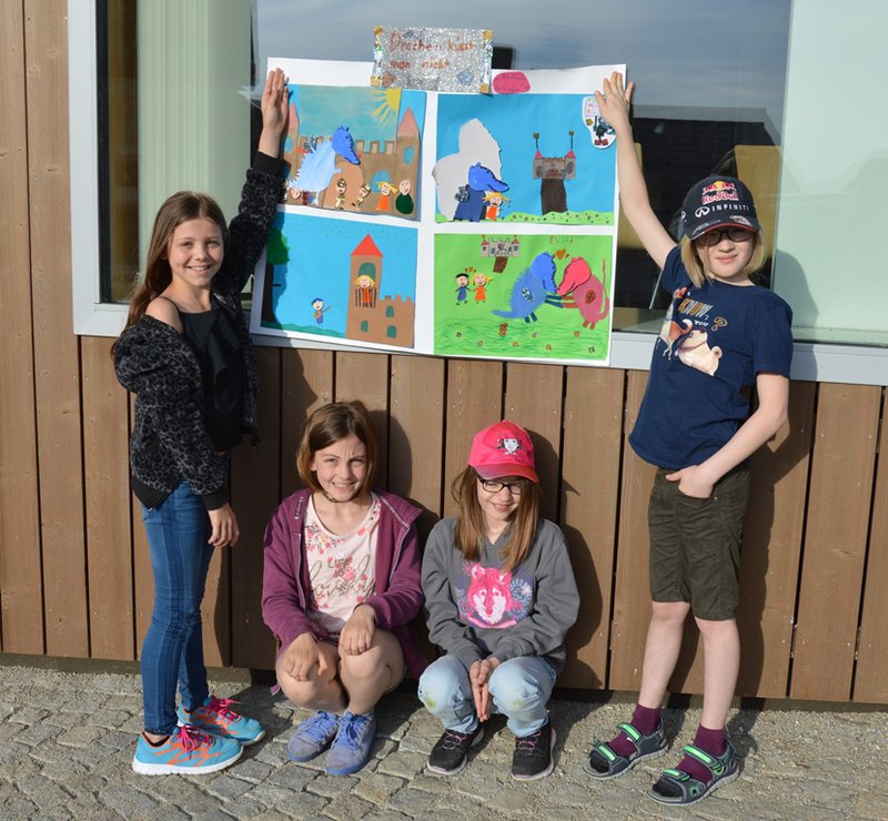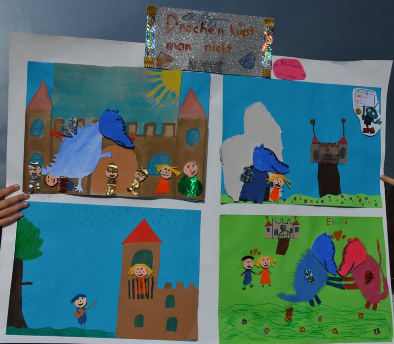 Die vier Mädchen aus der 4. Klasse der VS Bad Traunstein entschieden sich gemeinsam für dieses Buch. Der Titel und das Titelbild gefiel ihnen sehr und weckten das Interesse. Mit großer Motivation wollten die Mädchen das Buch in einer kurzen Bildgeschichte vorstellen. Die Köpfe der Drachen und Personen wurden sogar mit Laubsäge ausgeschnitten und liebevoll bemalt.- Projektleitung: