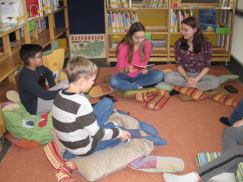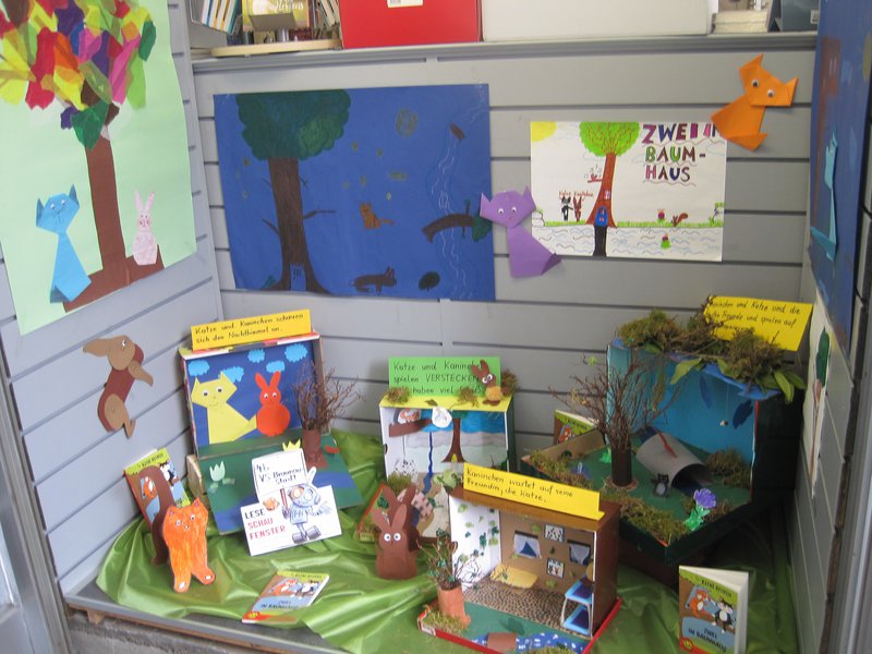 Im Dezember 2017 starteten wir mit unserem schulübergreifenden Projekt. Schülerinnen der Berufsschule Braunau lasen den Schülerinnen und Schülern der 4b der Volksschule Braunau-Stadt das Buch "Zwei im Baumhaus" von Käthe Recheis vor. Die Kinder sprachen mit den Berufsschülerinnen in Kleingruppen über das Gelesene und reflektierten den Inhalt in Form von Zeichnungen und Basteleien. Die VS-Kinder hatten tolle Ideen - so wurden Schuhschachteln gestaltet, Kaninchen und Origami-Katzen gefaltet, Plakate gemalt, "Kaninchen- und Katzenkekse" gebacken, usw. Mitte März wurde ein tolles, außergewöhnliches, kreatives Schaufenster in der Buchhandlung Lauf gestaltet. Örtliche Medien berichteten darüber. Der Leseförderer Stephan Lauf war vom Schaufenster dermaßen begeistert, dass er auf seiner Facebook-Seite viele Menschen darüber informierte. Dieses Projekt war für alle Beteiligten ein voller Erfolg - es förderte nicht nur die Kreativität und das Lesen, sondern auch die soziale Kompetenz.- Projektleitung: