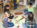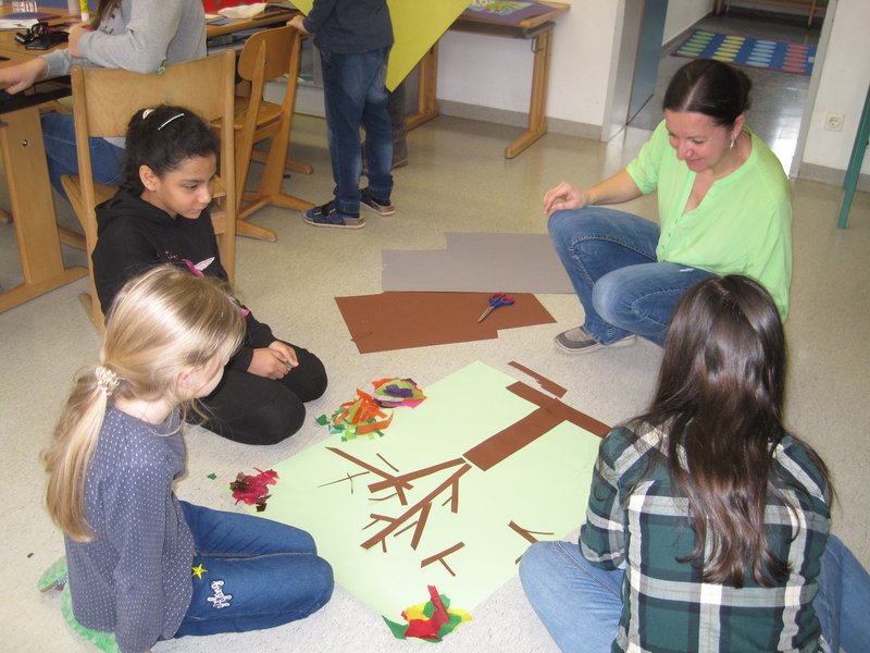 Die Kinder basteln das "Baumhaus" für Katze und Kaninchen
