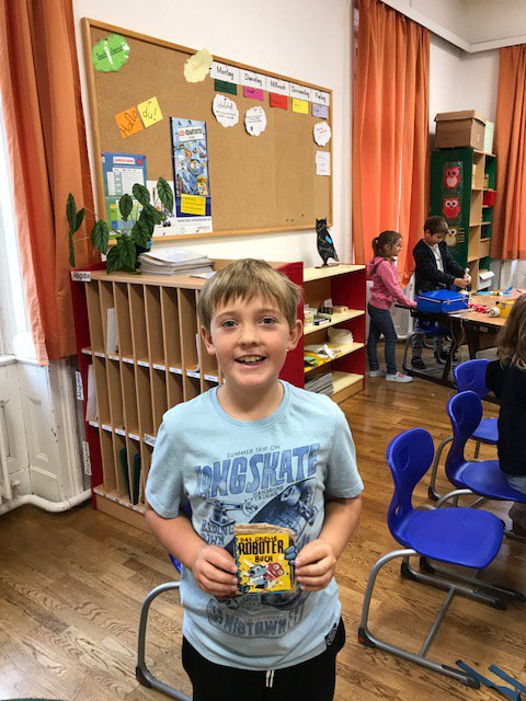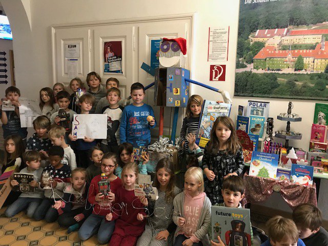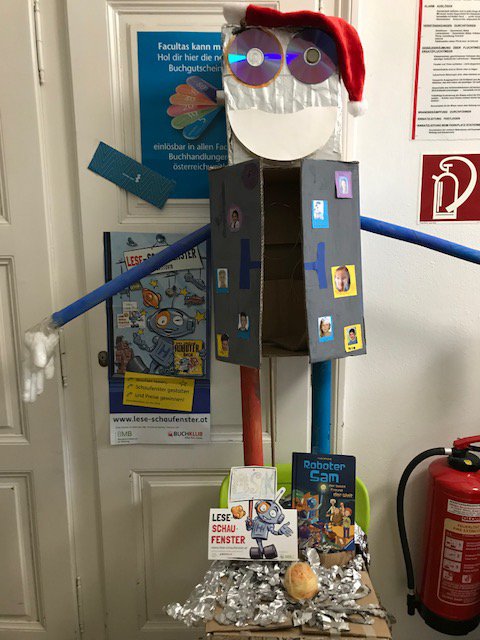 Der Anlass, das Buch „Roboter Sam“ als Klassenlektüre und Ausgangspunkt für das Lese-Schaufenster zu nehmen, bot uns das Plop, Flizz und Yep-Maskottchen "Hiro". Voller Inspiration tüftelten die Kinder der MSK an einem überlebensgroßen, aus allerlei Krimskrams bestehenden Roboter. Dieser erfüllt aber nicht nur Dekorationszwecke sondern dient, ausgestattet mit Fotos der SchülerInnen, auch als Geburtstagskalender. Wie sollte es auch anders sein, befindet sich In seinem Bauchraum ein von den Kindern gestaltetes Buch, aus dem unserer „Geburtstagsroboter“ – genauso wie sein Vorbild Hiro - sein Wissen bezieht. Das LESE-Schaufenster durften wir in der hauseigenen Facultas Buchhandlung, geleitet von Frau Alexandra Reich, gestalten. Dafür wurde unser ganz eigener Hiro sogar weihnachtlich gekleidet!- Projektleitung: