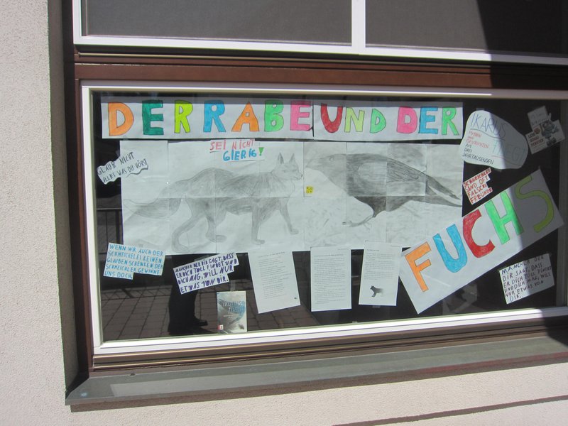Im Deutschunterricht wurden Fabeln gelesen und nacherzählt. Diese Nacherzählungen wurden dann aufgeschrieben. Mit den Kindern wurde der tiefere Sinn einzelner Fabeln besprochen und aufgeschrieben. Im Anschluss daran vergrößerten die Kinder in einer Gemeinschaftsarbeit das Bild des Rabens und des Fuchses.