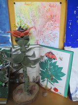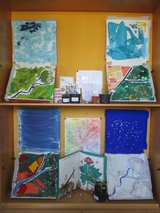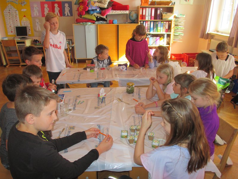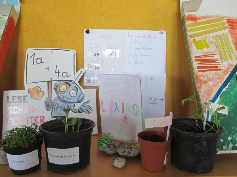Das Buch "Wazn teez?" wurde den Kindern der 1a Klasse und der 4a Klasse gemeinsam von den beiden Lehrkräften vorgestellt. Jede Bilderbuchseite war Anlass, um Mutmaßungen und Thesen zu dieser genialen Fantasiesprache zu bilden und brachte wiederum neue Erkenntnisse darüber. Im gemeinsamen Brainstorming wurden folgende Ideen zur Gestaltung des Leseschaufensters festgelegt: Anfertigung von dreidimensionalen Modellen zu den vier Jahreszeiten, Zeichnungen zum Jahreskreis, eintopfen unterschiedlicher Samen (wer wächst schneller?), füllen von leeren Medikamentenkapseln mit Erde und Radieschensamen, diese werden auf alte Bleistifte aufgesetzt und eingepflanzt (am Glasrand sieht man das Austreiben der Wurzeln und der Pflanze), Einsatz von Leseförderern aus der Erwachsenenwelt (Elternverein...), Gestaltung eines Übersetzungslexikons, Übersetzung des Buches in Deutsch, Bosnisch und Serbokroatisch, Vorstellung des Buches im Kindergarten u.v.m.