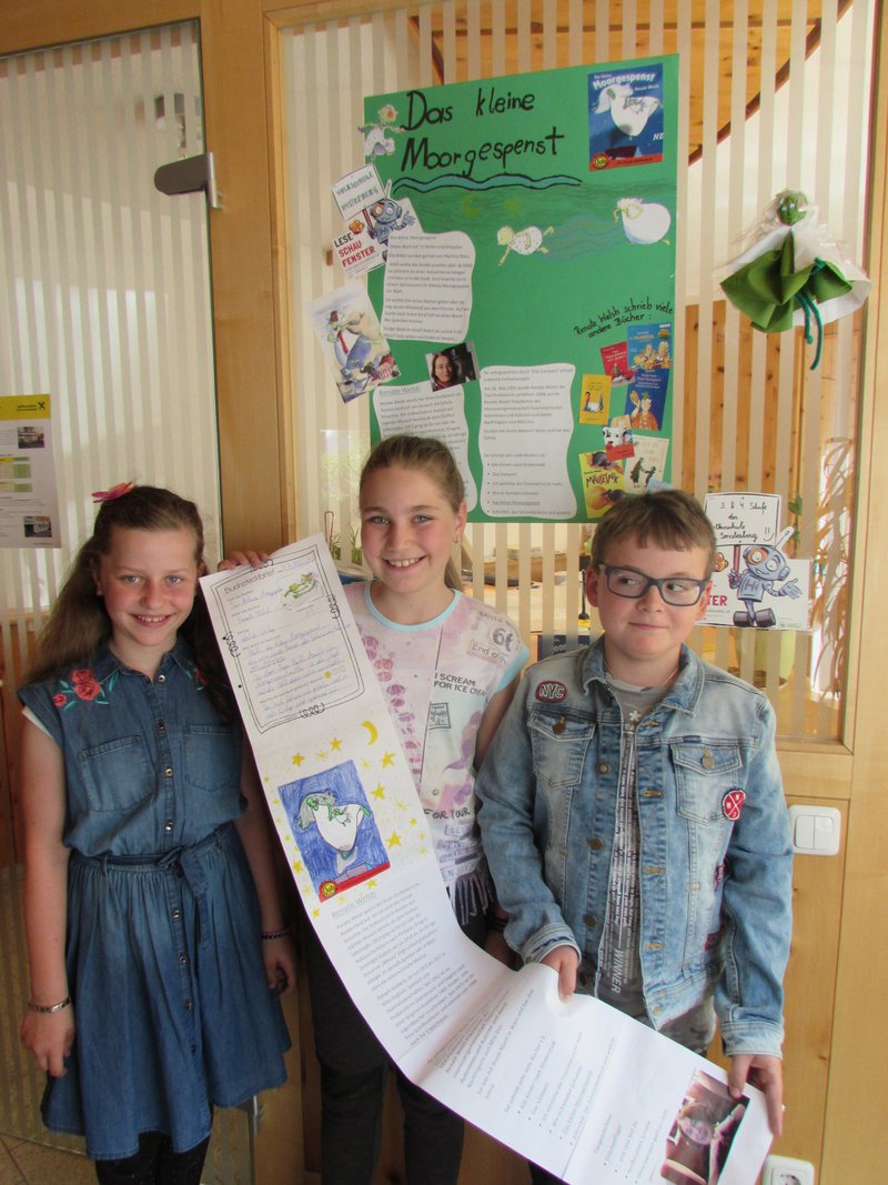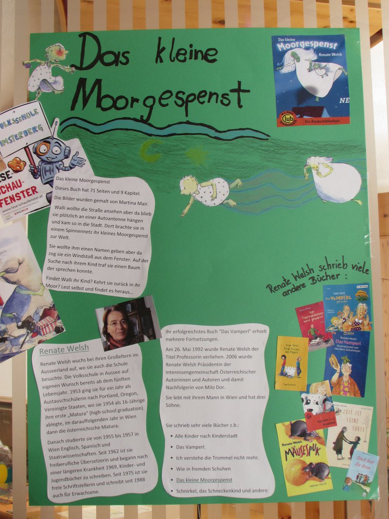 Die Schüler und Schülerinnen der Volksschule Imsterberg befassten sich intensiv mit Renate Welsh und dem Buch "Das kleine Moorgespenst". Gemeinsam wurde eine Lesedose gestaltet, ein Plakat zu Renate Welsh gemacht und Walli - das kleine Moorgespenst gebastelt. Alle Kinder lasen das Buch und gemeinsam wurde im Büchereikreis über die Erlebnisse von Walli gesprochen. Zusammen gestalteten die Kinder den Aufbau in der Raikafiliale in Imsterberg.- Projektleitung: