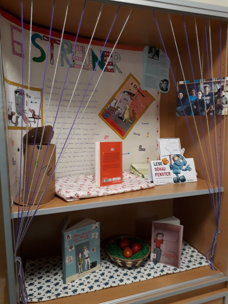 5 Schülerinnen u. Schüler der 2a gestalteten im Rahmen des Deutschunterrichts dieses Leseschaufenster für die Aula der NMS.- Projektleitung: