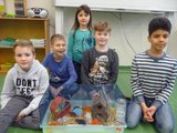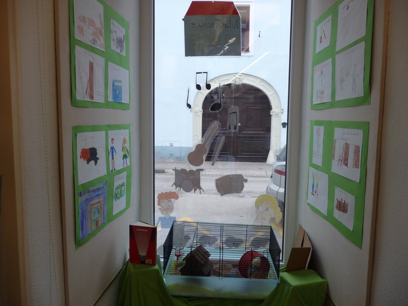 Einen Kriminalfall zu lösen, sorgte in der 3a-Klasse für große Spannung. Jeden Tag las ein Schüler ein Kapitel aus dem Buch der Klasse vor und malte ein Bild dazu. Es entstand eine Bildgeschichte, die seitlich an den Wänden hängt. Die 9 Meerschweinchen, die nach den 9 Planeten benannt sind (Kärtchen vor dem Käfig), bilden mit dem Käfig den Mittelpunkt. Dieser wurde eingerichtet und die gebastelten Haustiere auf einer Platte befestigt. Die Musikschule des Herrn Herr mit den vorkommenden Instrumenten, hängt als Mobile von der Decke. Das Wissen über die Instrumente wurde im Musikunterricht vertieft. Die Mäuse hüpfen aus einem Kasten der Musikschule, der aus Karton hergestellt wurde. Die zwei Hauptfiguren auf der Fensterscheibe, wurden von zwei Schülerinnen gemalt. Den Inhalt des Buches fasste die Lehrerin als Erinnerung zusammen. Im Rahmen der Lesenacht wurden die verschiedenen Lese-Schaufenster der VS in Eggenburg bewundert.- Projektleitung: