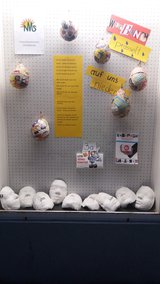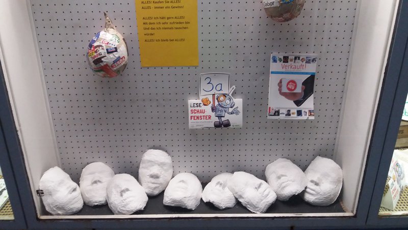 In die Welt der Werbung tauchten die Schülerinnen und Schüler der 3a mit der Lektüre dieses Buches. Zahlreiche spannende Fakten und oft unglaubliche Zahlen verblüfften und überraschten. Im BE-Unterricht stellten sich die Schüler/Innen nun die Frage, wie man die Wirtschaftswerbung, die uns tagtäglich begegnet, im Schaufenster präsentieren kann. Werbung prasselt auf uns nieder - das war der Slogan, für den sie sich entschieden haben und das geschieht in Form von überdimensionalen Tropfen, die aus Pappmache hergestellt wurden. Die Tropfen prasseln auf die Menschen, die im Schaufenster als Gipsabdrucke ihrer Gesichter eindrucksvoll dargestellt sind.