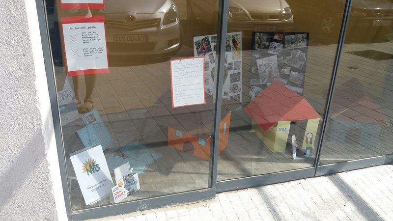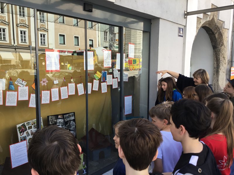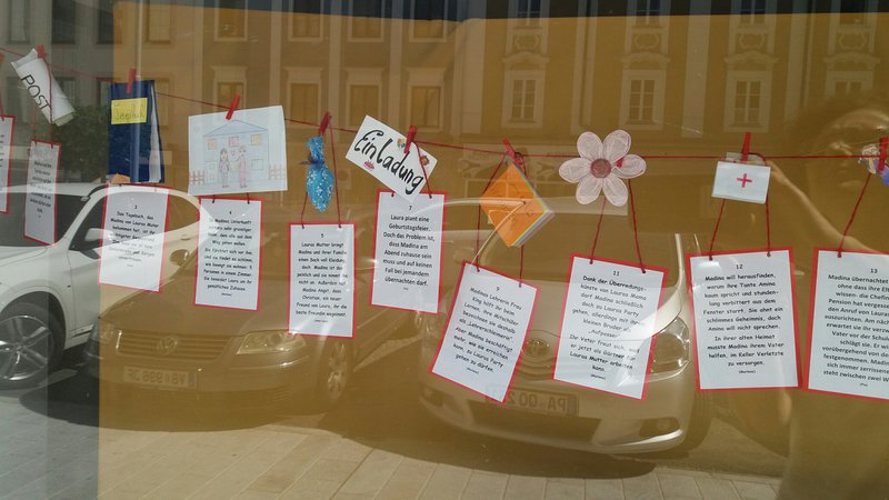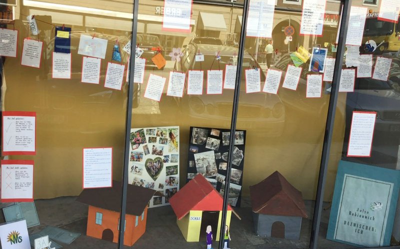 Die Lektüre dieses Romans in Tagebuchform war für eine dritte Klasse NMS durchaus anspruchsvoll und herausfordernd, gleichzeitig wurde dadurch eine tief gehende Identifikation mit der Protagonistin erreicht. Die Kinder erfuhren nicht nur viel Neues, sie konnten auch – wenigstens ansatzweise- nachempfinden, wie es sich anfühlt, in einer neuen Kultur ganz von vorne zu beginnen. Um den „roten Faden“ durch das Buch sichtbar zu machen, brachten die Schüler und Schülerinnen den Inhalt überblicksmäßig zu Papier und suchten bzw. bastelten Symbole zu den einzelnen Kapiteln. Darunter ließen sie die Lebenswelten der Hauptfigur und deren Freundin entstehen: In der Mitte die Schule als gemeinsamer Lebensraum, dahinter und daneben die „Herkunftswelten“ der beiden Mädchen. Abgerundet wird das Schaufenster durch persönliche, handschriftliche Buchkritiken.- Projektleitung:
