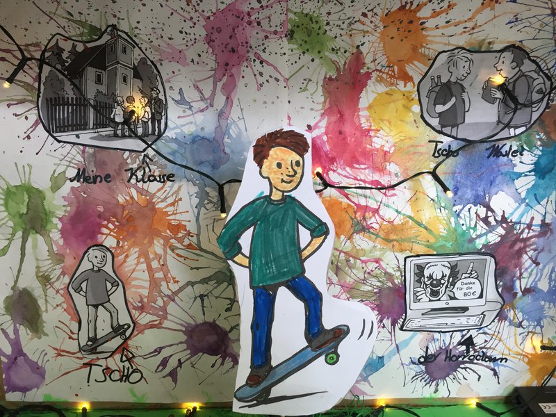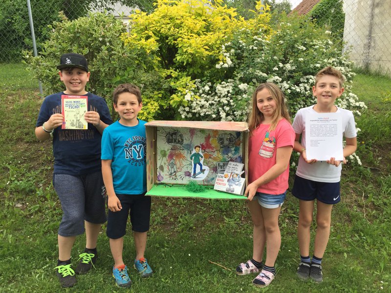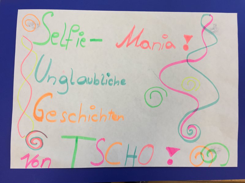 Die vier Mitglieder dieser Gruppe lasen abwechselnd einzelne Kapitel des Buches "Selfie-Mania!", notierten sich dazu das Wichtigste und erzählten es sich anschließend. Einige wienerische Ausdrücke waren den Kindern unklar. Auch würden sie dieses Buch eher älteren Kindern empfehlen, da der zwölfjährige Protagonist aus seinem Leben erzählt, und dies Jugendlichen wahrscheinlich eher zusagt. Diese Gruppe entschied sich bei der Gestaltung dazu, Szenen des Buchs farbenfroh und mit Lichteffekten zu präsentieren.- Projektleitung: