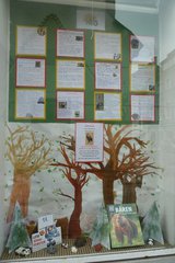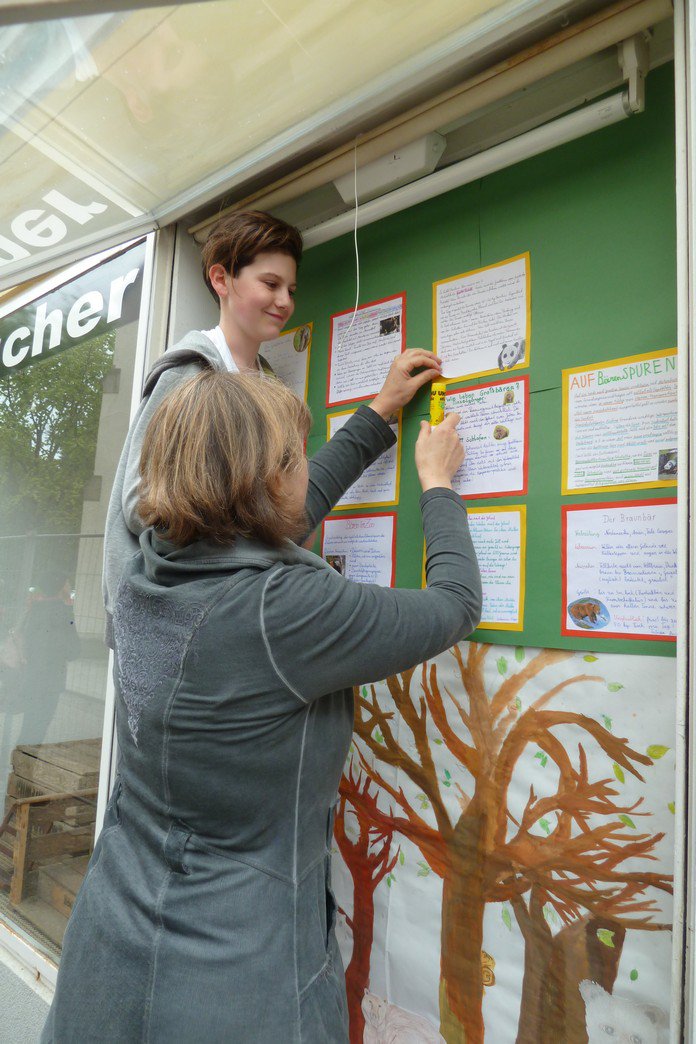 In Partnerarbeit setzten sich die Kinder im Deutschunterricht mit einzelnen Kapiteln des Buches auseinander. Diese zu exzerpieren und auf einem Format von 19 x 19 cm die wichtigsten Informationen handschriftlich zu präsentieren, erwies sich als echte Knochenarbeit – umso stolzer machten die Ergebnisse. In BE wurden Bären und ein „Bärenwald“ gezeichnet, im Werkunterricht verschiedenste Bären aus Salzteig geformt. Dass es auch einige Sprichwörter gibt, in denen Bären vorkommen, brachte uns auf die Idee eines Gewinnspiels. Da unser Schaufenster zu einer Buchhandlung gehört, baten wir den Buchhändler um die Bereitstellung einiger Buchpreise. Abgerundet wurde die Arbeit am Schaufenster durch eine Vernissage, bei der die Kinder ihre Arbeiten vor den anderen Klassen präsentierten und auch die Ergebnisse der anderen Klassen bewundern durften.