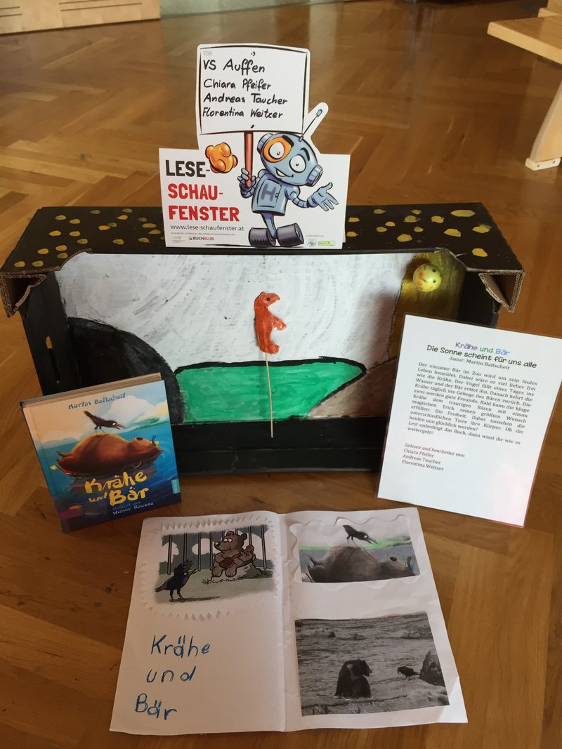 Die drei Kinder dieser Gruppe lasen abwechselnd einzelne Kapitel des Buches "Krähe und Bär", notierten sich dazu das Wichtigste und erzählten es sich anschließend. Die Geschichte rund um die Entstehung der Freundschaft der beiden unterschiedlichen Tiere gefiel den Kindern dieser Gruppe. Bei der Gestaltung vertieften sich die Kinder in das Zoogehege des Bären.- Projektleitung:
