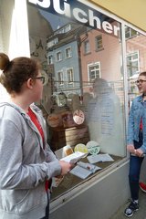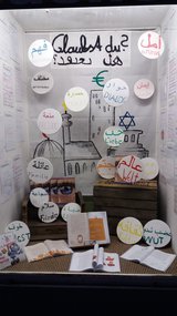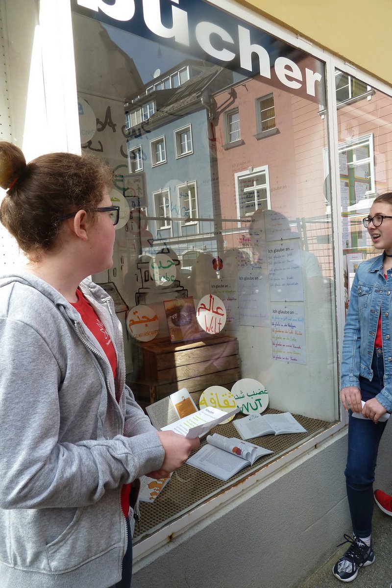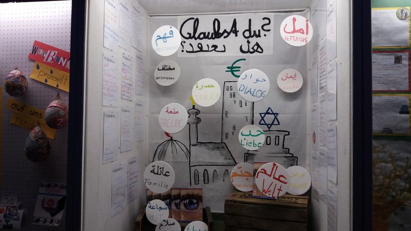 Im Rahmen eines Klassenprojekts über den Islam haben wir uns mit dem Buch „Glaubst du?“, insbesondere mit den abwechslungsreichen Erzählungen über den Islam, beschäftigt. Verschiedene „Schlagwörter“ in Arabisch und Deutsch prägen das Schaufenster. Diese wurden auf Stoff gemalt, anschließend wurden damit Blumenuntersetzer bezogen. Den Schaufenster-Hintergrund bilden die drei Gotteshäuser der drei führenden Weltreligionen. Diese werden vom höchsten Gebäude – dem Turm des Glaubens ans Geld - überragt. Weiters hat jede Schülerin und jeder Schüler ihre/seine persönlichen Glaubenssätze aufgeschrieben. Bei einer Vernissage präsentierte die 3c den anderen Klassen ihr Schaufenster.- Projektleitung: