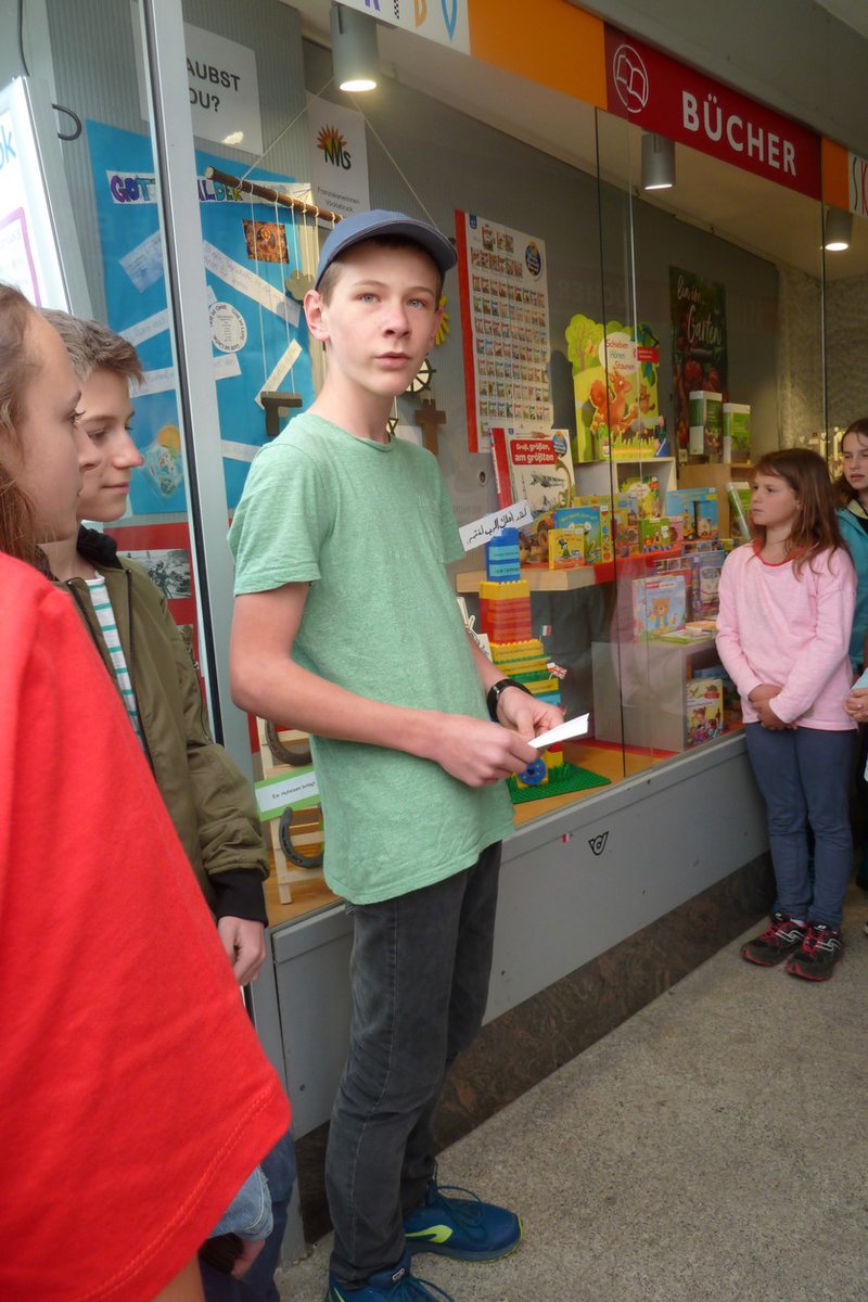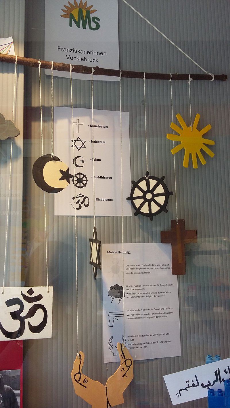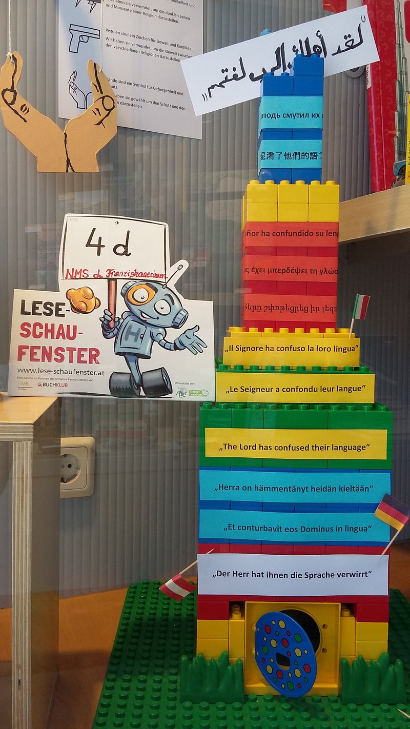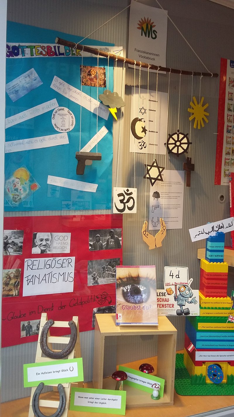 Wie und was Menschen glauben ist eine spannende Frage. Deshalb haben wir das Buch „Glaubst du?“ für unser Lese-Schaufenster im Fach Religion ausgewählt und in Gruppen die verschiedenen Themen des Buches bearbeitet. Zum Thema „Gottesbilder“ bearbeitete eine Gruppe die Frage: „Wie stellen sich verschiedene Menschen Gott vor?“ und erstellte dazu ein Plakat. Die zweite Gruppe hatte die „Sprache als Ursache für Verständnis und Missverständnis“ zum Thema. Bei der Auseinandersetzung mit der Erzählung vom Turmbau zu Babel entstand ein bunter Turm aus Legosteinen, der die verschiedenen Sprachen zeigt. Eine dritte Gruppe zeigt im Schaufenster Symbole des Aberglaubens. Wozu Fanatismus in den Religionen führen kann, drückt das Plakat einer weiteren Gruppe aus. Über allem hängen die Symbole der Weltreligionen, zu denen Jugendliche im Buch jeweils ihre eigene Geschichte erzählen. Das Buch ermöglicht insgesamt eine vielfältige Auseinandersetzung mit dem Thema „Glauben“.- Projektleitung: