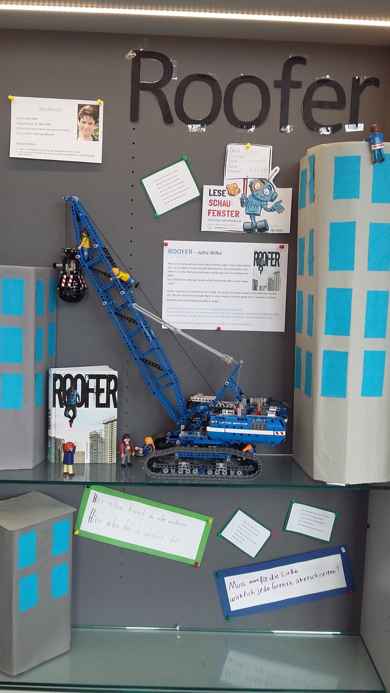 Die Schülerinnen und Schüler der 4. Klassen der NMS Neumarkt haben zuerst von den, auf der Homepage vorgeschlagenen Büchern, ein Buch ausgewählt und gelesen. Danach wurden in 2 er, 3 er , 4 er oder 5 er Gruppen die Schaufenster dekoriert. Dazu wurden voerst die Vitrinen der Schule zur Verfügung gestellt. Ingesamt entstanden 12 Leseschaufenster zu 4 ausgewählten Büchern. Da die Kinder wussten, dass nur ein Schaufenster öffentlich ausgestellt werden kann, waren sie mit Eifer und guten Ideen bei der Sache. So konnte dieses Schaufenster von den Buben, mit einem eigens dafür angefertigten Kran letzen Endes überzeugen und ist in Neumarkt bei der Kleintierpraxis zu sehen. Auch die Werbung für die anderen Kinder der Schule ist nicht zu unterschätzen. Viele unserer Schüler aus den anderen Klassen haben die "beworbenen" Bücher bereits gelesen.