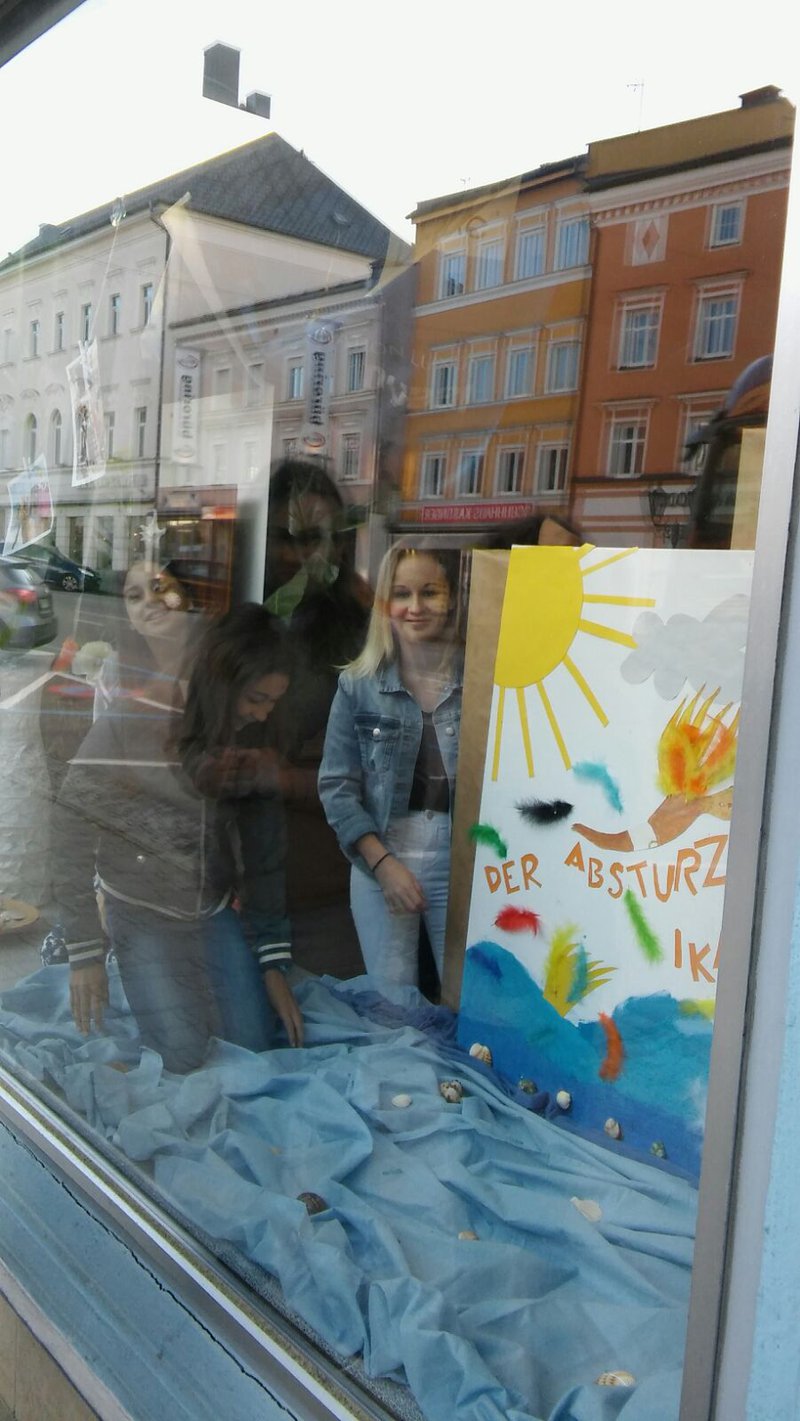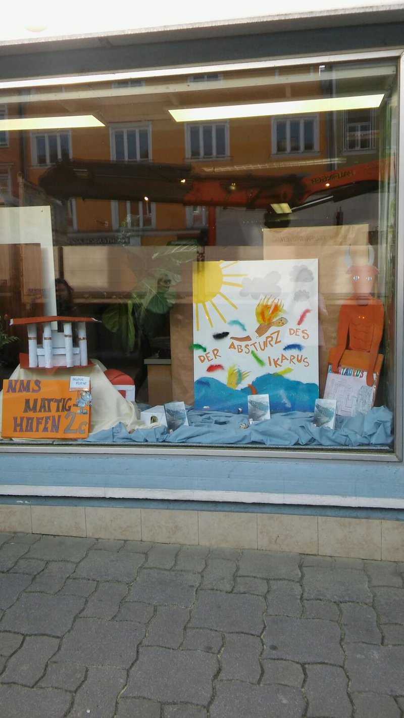 Rechts: Minotaurus Links: Akropolis mit Tempel Mitte: Keilrahmen mit dem Absturz des Ikarus Vorne: Das ikarische Meer