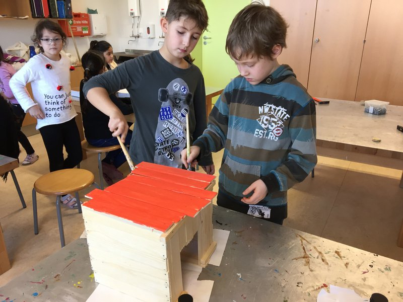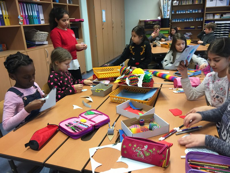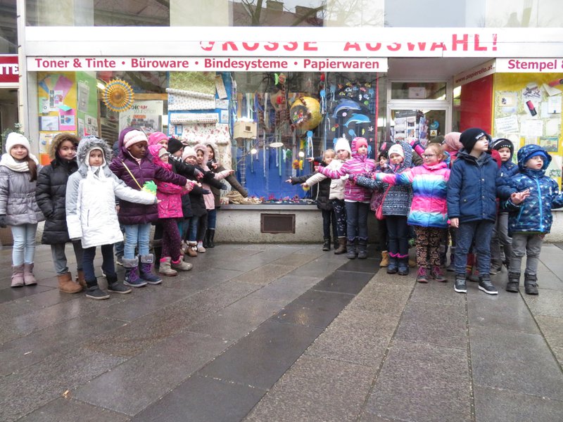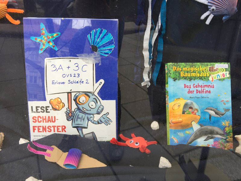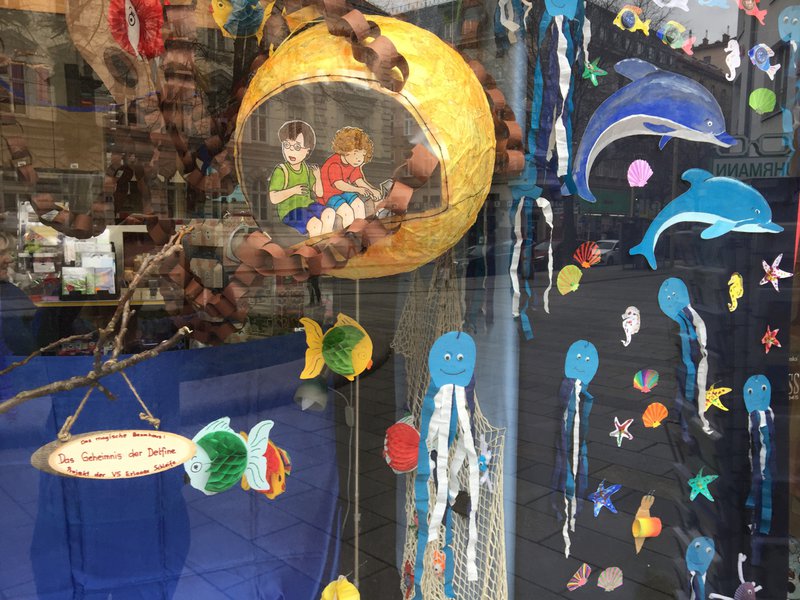 Die Kinder beider Klassen lasen das Buch im Laufe des Dezember selbstständig. Anschließend stellten wir innerhalb der Klassen Überlegungen an, wie wir die Auslage gestalten wollten. Wir entschlossen uns, die im Buch vorkommenden Tiere, das Unterseeboot und das Baumhaus zu basteln. In einem 5-stündigen Workshop werkten dann alle Kinder der 3c und der 3a. Am nächsten Tag wurden alles Werke in die Auslage gestellt. Zuletzt machten beide Klassen einen Ausflug zu "unserer" Auslage.