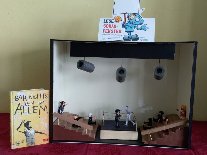 Es handelt sich um ein Gemeinschaftsprojekt zweier Schüler der 3 d (7. Schulstufe). Die Arbeit zeigt eine Szene aus dem Roman "Gar nichts von allem".- Projektleitung: