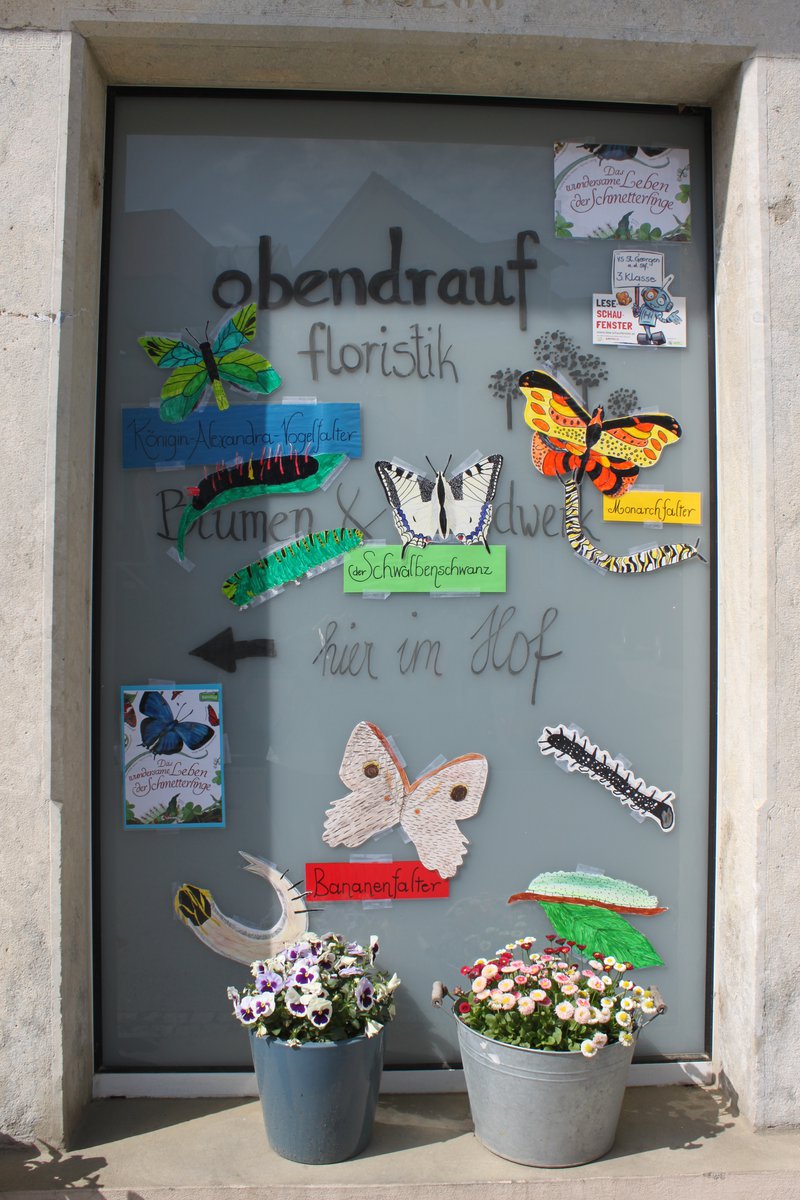 Das wundersame Buch der Schmetterlinge wurde den Kindern im Blumengeschäft vorgelesen. Danach gab es ein gemeinsames Gespräch mit den Floristinnen über die Bedeutung der Schmetterlinge in der Natur. Wieder zurück in der Schule erarbeiteten die Kinder mit einem Leseplan die einzelnen Wissensgebiete aus dem Sachbuch. Zum Abschluss recherchierten die Schüler in Partnerarbeit mittels I-Pad das Aussehen einzelner Schmetterlinge und Raupen und setzten es bildnerisch um. Die Ergebnisse wurden foliert und gemeinsam im Schaufenster aufgehängt.- Projektleitung:
