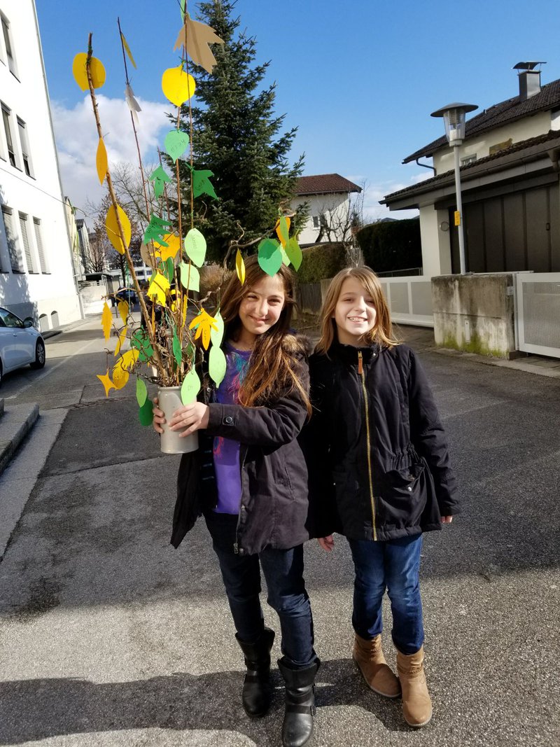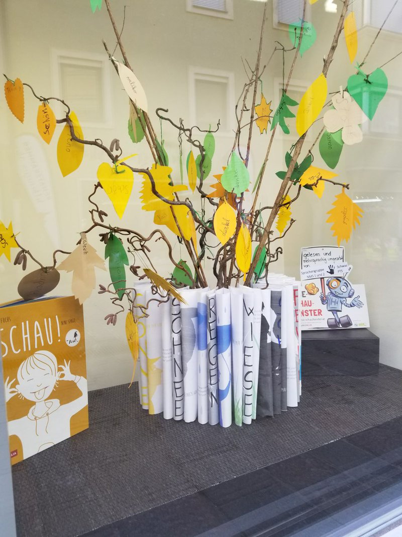 Das blinde Mädchen Nele aus dem Buch "Schau!" weiß, dass man nicht nur mit den Augen gut sehen kann. Die Schülerinnen und Schüler der Sprachengruppe Schwaz (eine schul-, klassen- und jahrgangsübergreifende Deutschgruppe mit Kindern aus vielen Ländern) stellen auf diesem Sprachbaum bildnerisch da, wie sie ihre Umwelt fühlen und wie sie dies in ihren Erst- und Zweitsprachen ausdrücken.- Projektleitung: