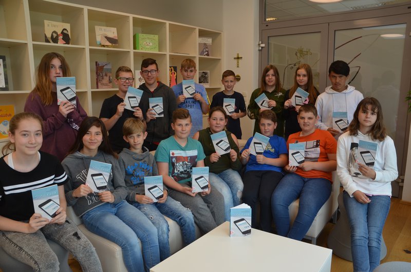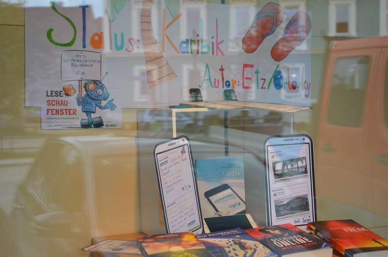 Das Buch wurde vorerst als Klassenlektüre (zu Hause) gelesen; nach bestimmten Abschnitten wurden immer wieder Vermutungen über das weitere Geschehen angestellt, ehe bis zur nächsten Stunde weitergelesen wurde. Es gab immer wieder viel "Gesprächsstoff" - gerade auch über Facebook und Postings. Schließlich galt es zu überlegen, wie die Gestaltung im Schaufenster unseres örtlichen Buchhändlers (Fa. Lehner) sein soll. Wir entschieden uns für die Kurzbeschreibung der Charaktere sowie Bekanntgabe des Inhalts, ohne den Schluss zu verraten. Als Blickfang sollten ein kleines Plakat und Handys (auch als Formatvorlage für die Beschreibungen) dienen.