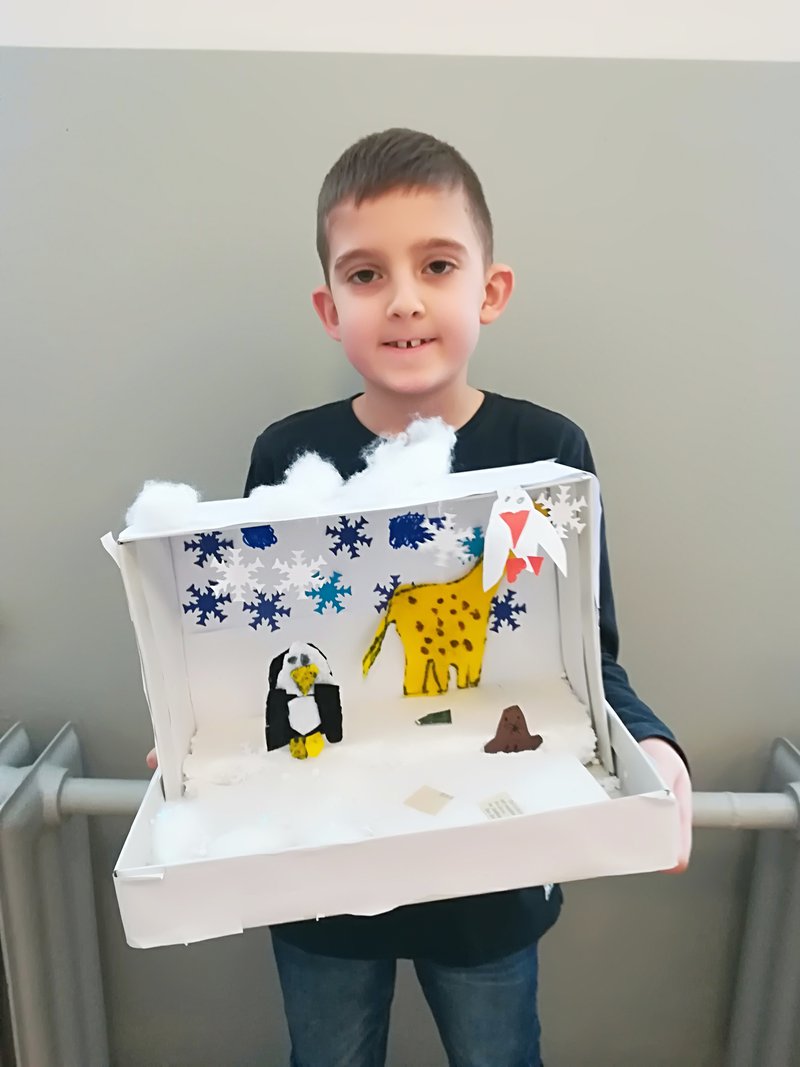 Nachdem das Buch gemeinsam gelesen bzw. vorgelesen worden war, ging es an die Arbeit: Die Kinder schrieben Briefe an Pinguin oder Giraffe. Es gab einen Lieblingsbuchtag, ein andermal galt es, die Geschichte von Pinguin und Giraffe weiterzuerzählen. Auch Sachtexte über die zwei unterschiedlichen Tiere wurden gelesen und deren Lebensräume erkundet. Dies alles wurde in einer Projektzeitung festgehalten. Am meisten Spaß hat den Kindern das Basteln der Leseschachteln bereitet!