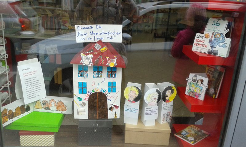 Ausgangspunkt unseres Schaufensters ist die Musikschule des Herrn Herr, in der die Haupthandlung spielt. Zahlreiche Instrumente schmücken das Gebäude. In den Fenstern des oberen Stockwerkes sind die Mäuse zu sehen, die Verwirrung stiften. Weiters haben wir die handelnden Personen dargestellt und sie kurz beschrieben, sowie die neun Meeerschweinchen mit ihren Planetennamen. Auch der Kurzinhalt darf nicht fehlen. Alle hatten große Freude beim Lesen und beim Basteln!- Projektleitung: