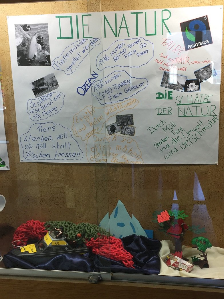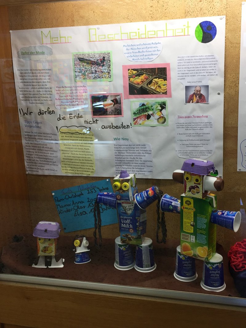 3 Teams der Klasse 3B beschäftigten sich mit 3 ausgewählten Kapiteln des Buches. Mehr Bescheidenheit, Mehr Frieden, Mehr Nähe zur Natur. Mehr Bescheidenheit: Die Plastikmüllfamilie symbolisiert die Jahrhunderte dauernde Verrottungszeit von Plastikmüll. Mehr Frieden: Die brennende Stadt steht für die Flüchtlingskrise und die Weigerung der Menschen zur Friedensentwicklung. Mehr Natur: Das Playmobilschiff steht für Öltankerunfälle und Überfischung im Ozean.- Projektleitung: